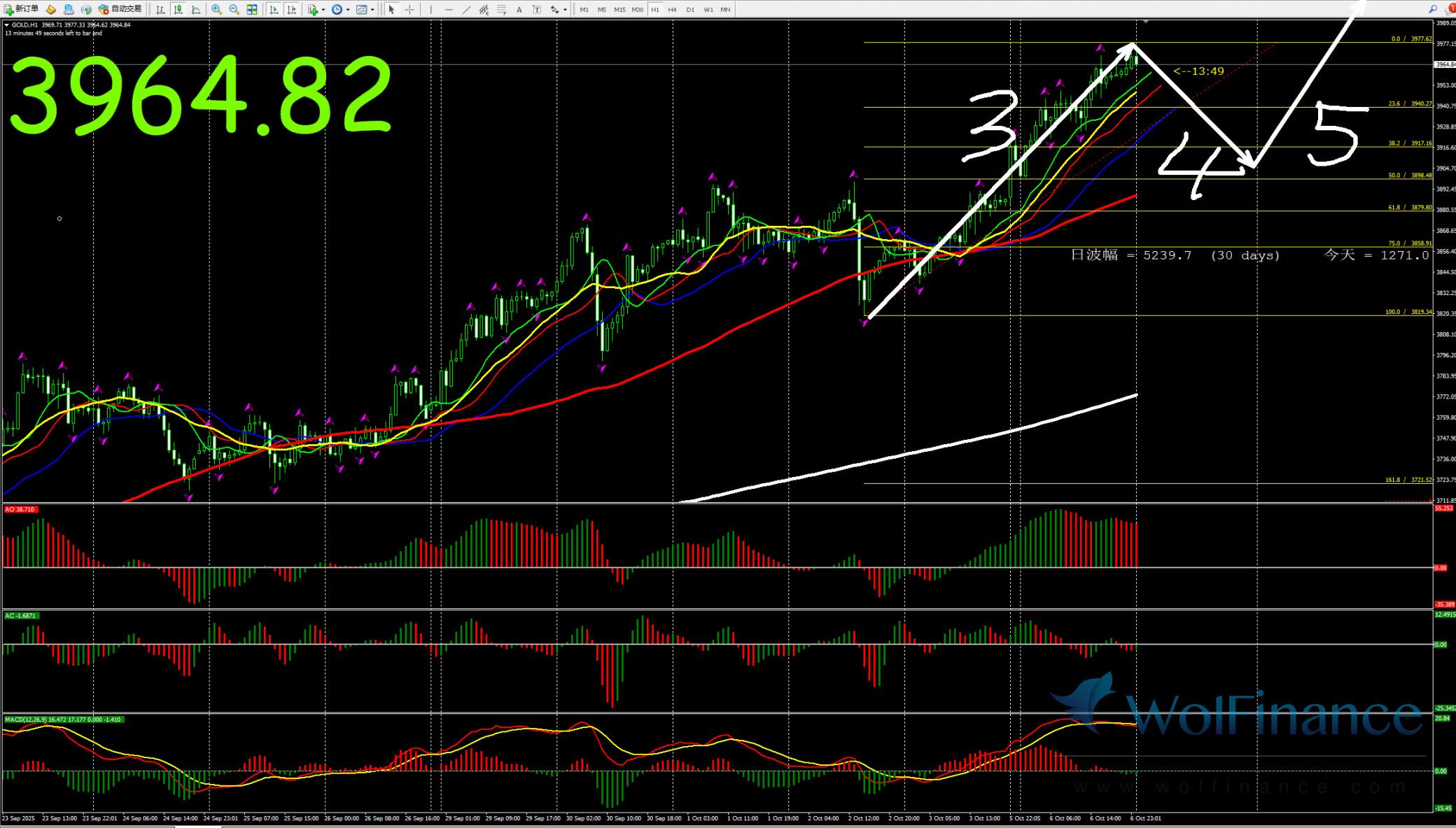 日线级别行情处于5浪行情,关注5浪行情走势,在日线图中关注压力倾向在日线图4000一线附近;支撑倾向在日线图50%(3644);61.8%(3566);四小时行情处于5浪状态,关注5浪的行情走势。支撑倾向在3850附近。1小时图AO零轴上红色,AC零轴下绿色,代表在小时图中,行情倾向隔夜小时图处在3浪行情,目前在小时图中关注3浪的行情走势,下方支撑3850附近。在1小时图中,行情上涨压力关注4000附近。