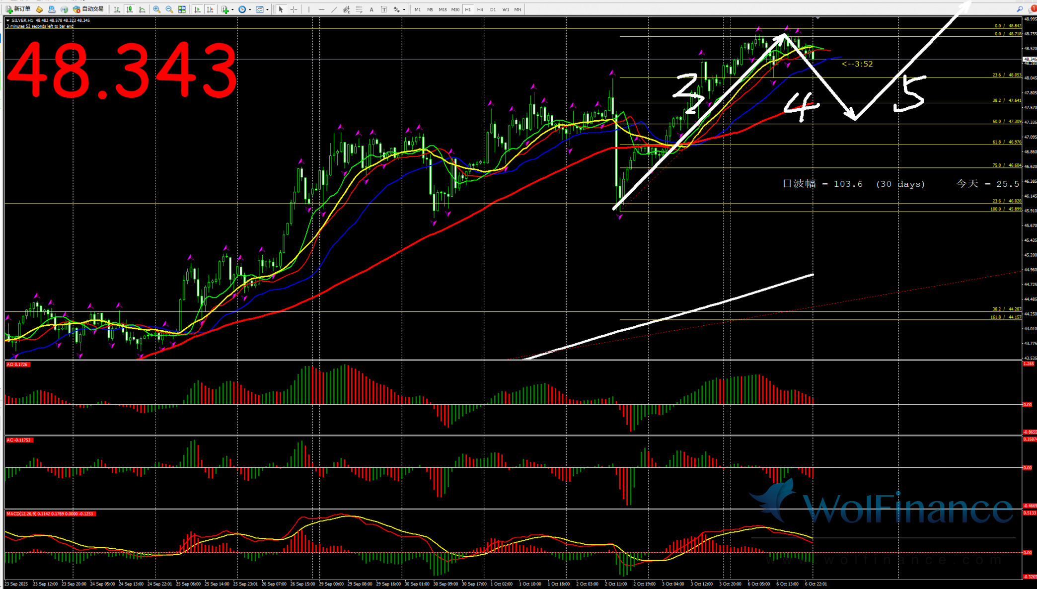 日线图目前处在3浪之中,关注3浪的行情走势。压力倾向在日线图49.10一线附近;支撑倾向在日线图50%(42.88)和61.8%(41.47)一线附近;四小时行情处在3浪走势;并关注上方压力49.10一线附近;1小时图AO零轴上红色;AC零轴下红色,行情在小时图356日线之上运行;小时图关注49.10附近的压力;所以今日关注1小时图震荡行情。
