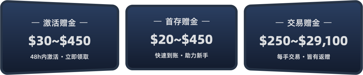 于注册账户48小时内激活账户,即可领取【激活赠金券】 【激活奖励】无需交易,仅需完成【首存赠金】交易手数,即可申请兑换。 |