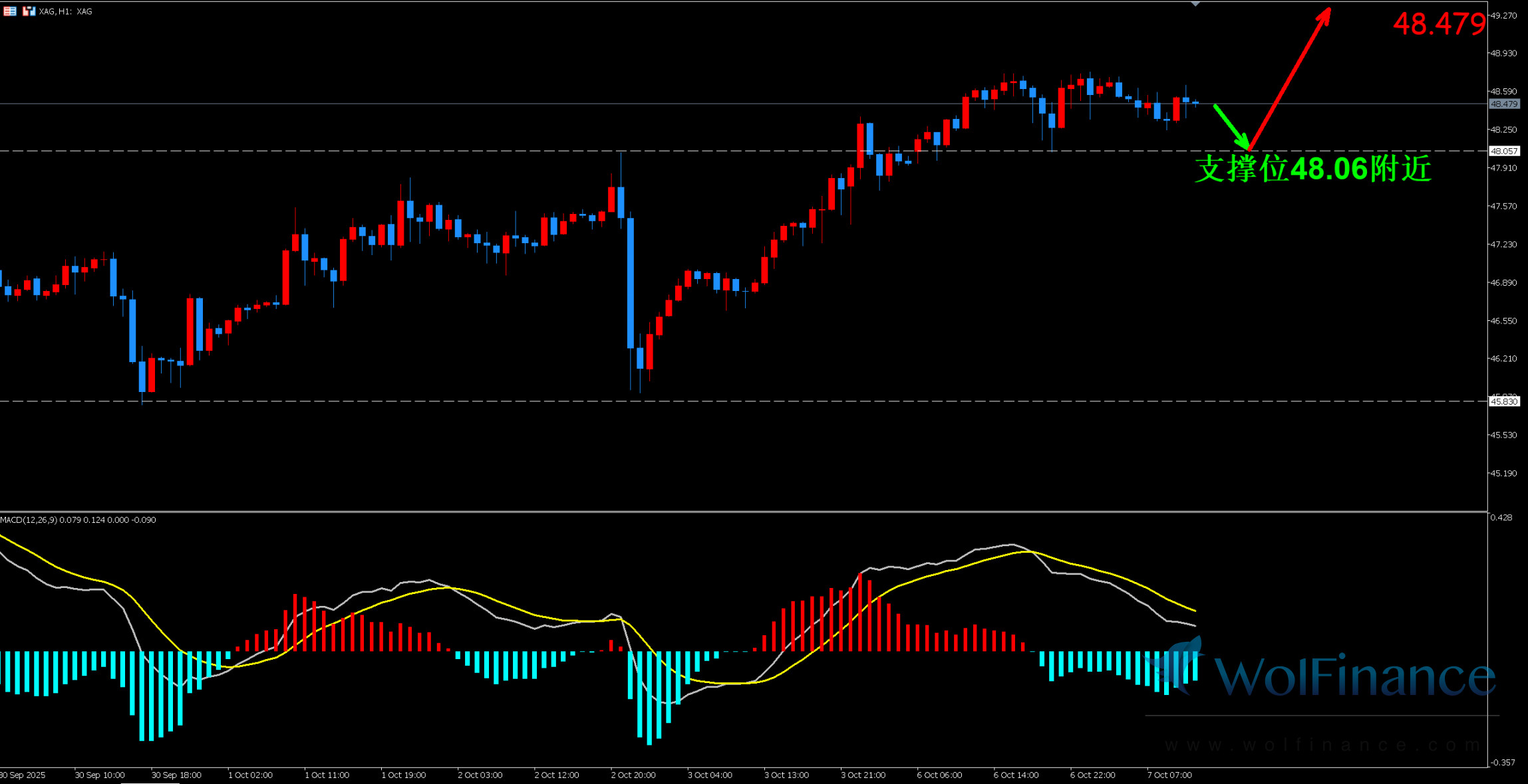 1. 白银技术指标avg显示目前K线在下轨附近运行,小时图周期为行情价格盘整,下方支撑48.05