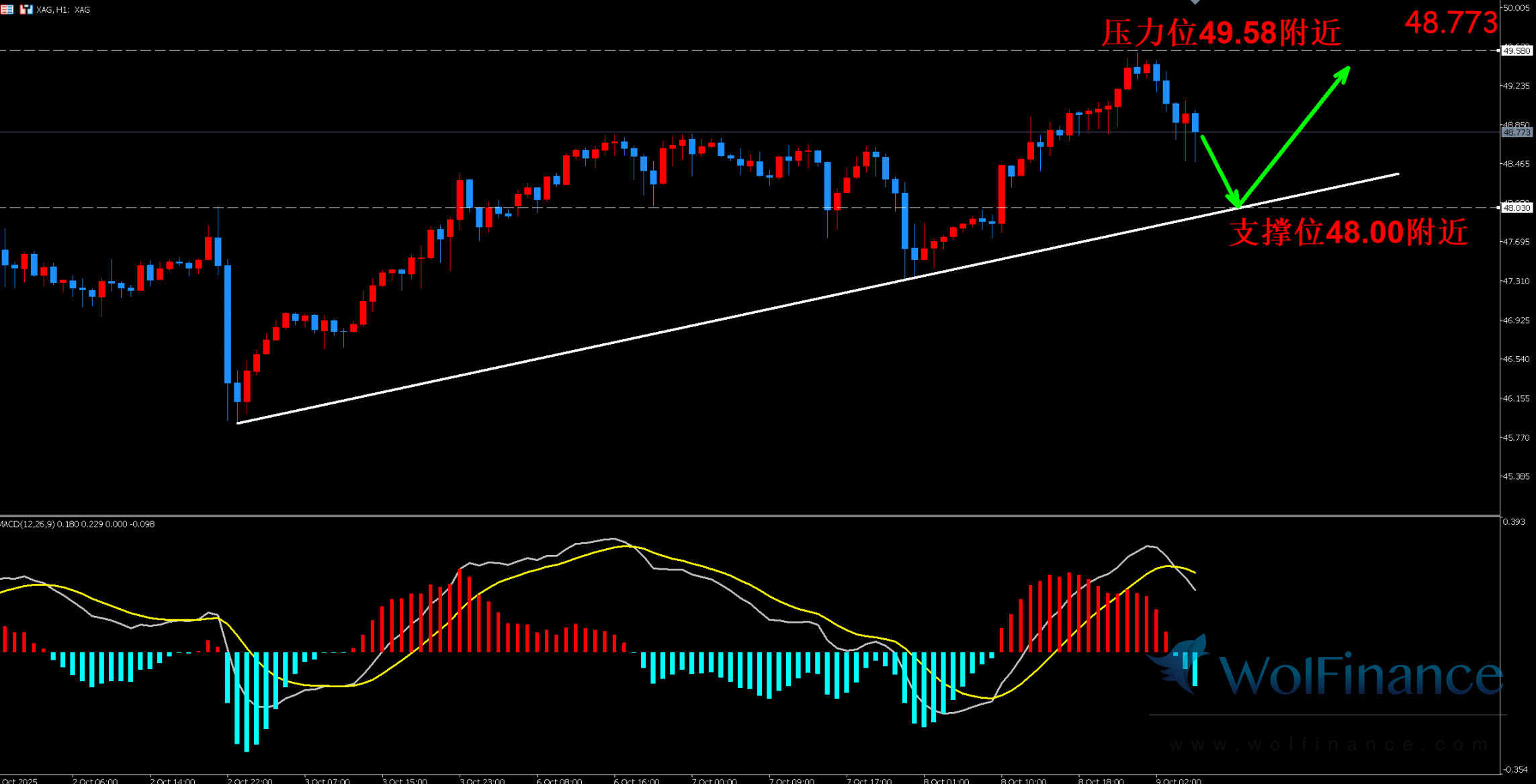 1. 白银技术指标avg显示目前K线在下轨附近运行,小时图周期为行情价格盘整,下方支撑48.05