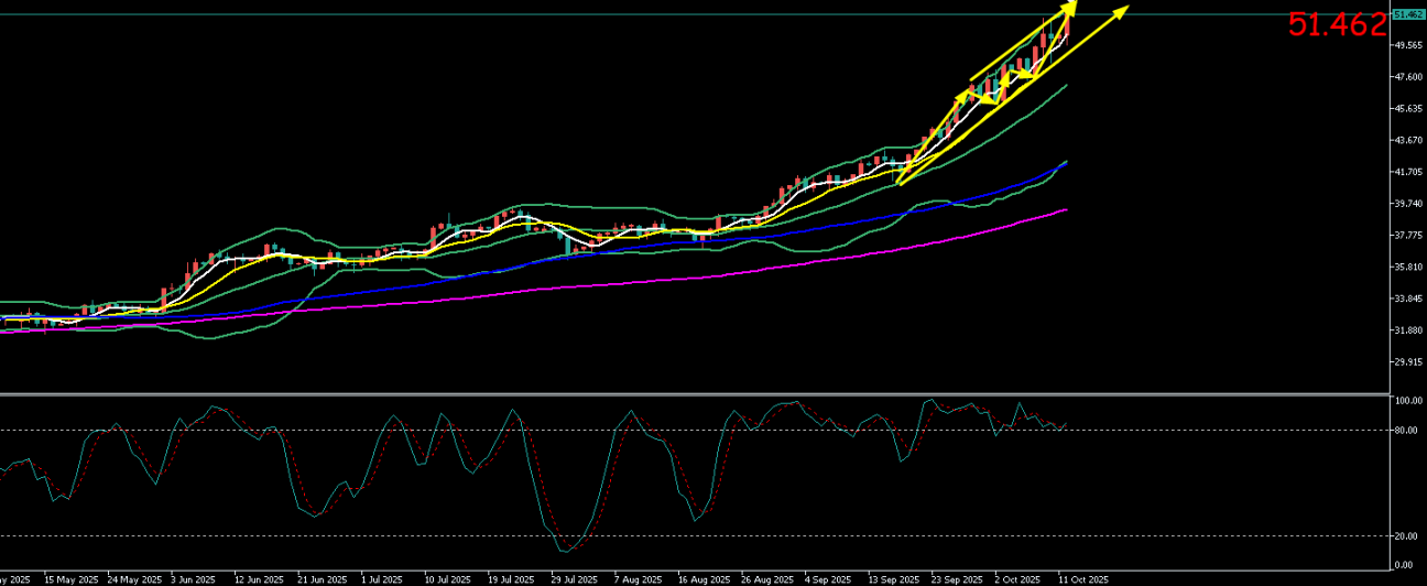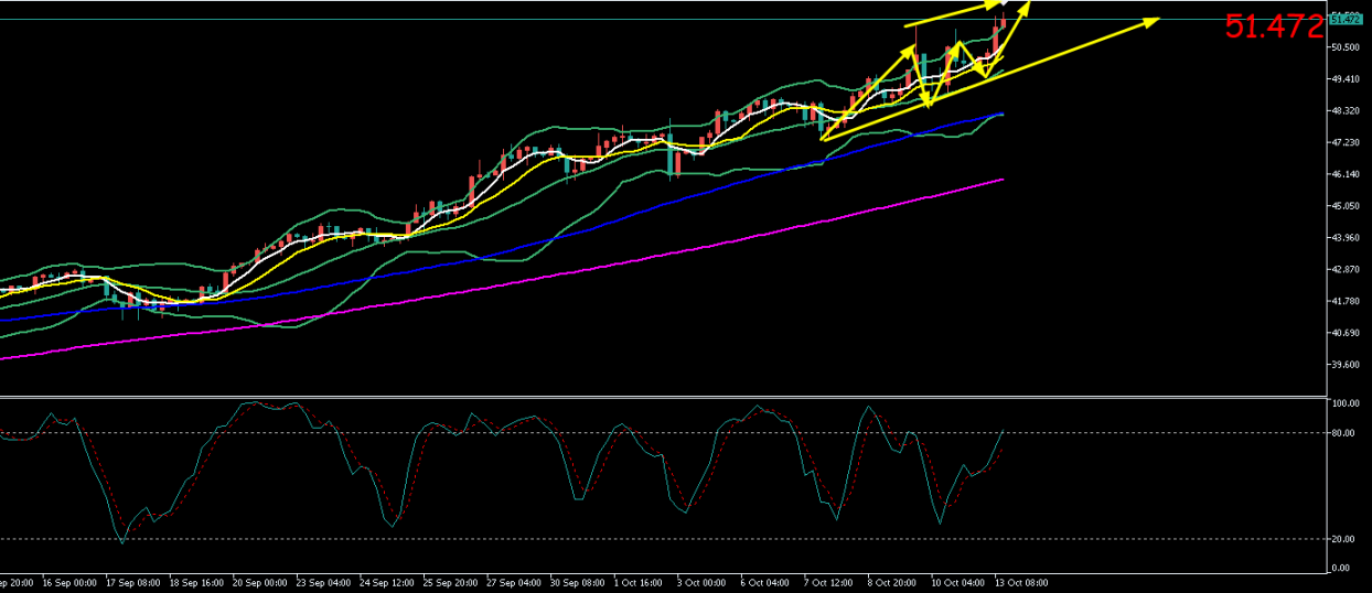 白银日线级别价格再次沿5MA水平破新高。4小时级别价格呈现震荡上行格局运行。价格远离5MA持续运行在布林上轨之上。短期价格持续上升,即将试探至上方趋势线压力52.3附近。短期价格持续上升但也伴随超卖和回归5MA的压力。,亚欧盘关注下方支撑50.8一线不破,可持续看涨破高。上方关注52.3一线趋势线压力。