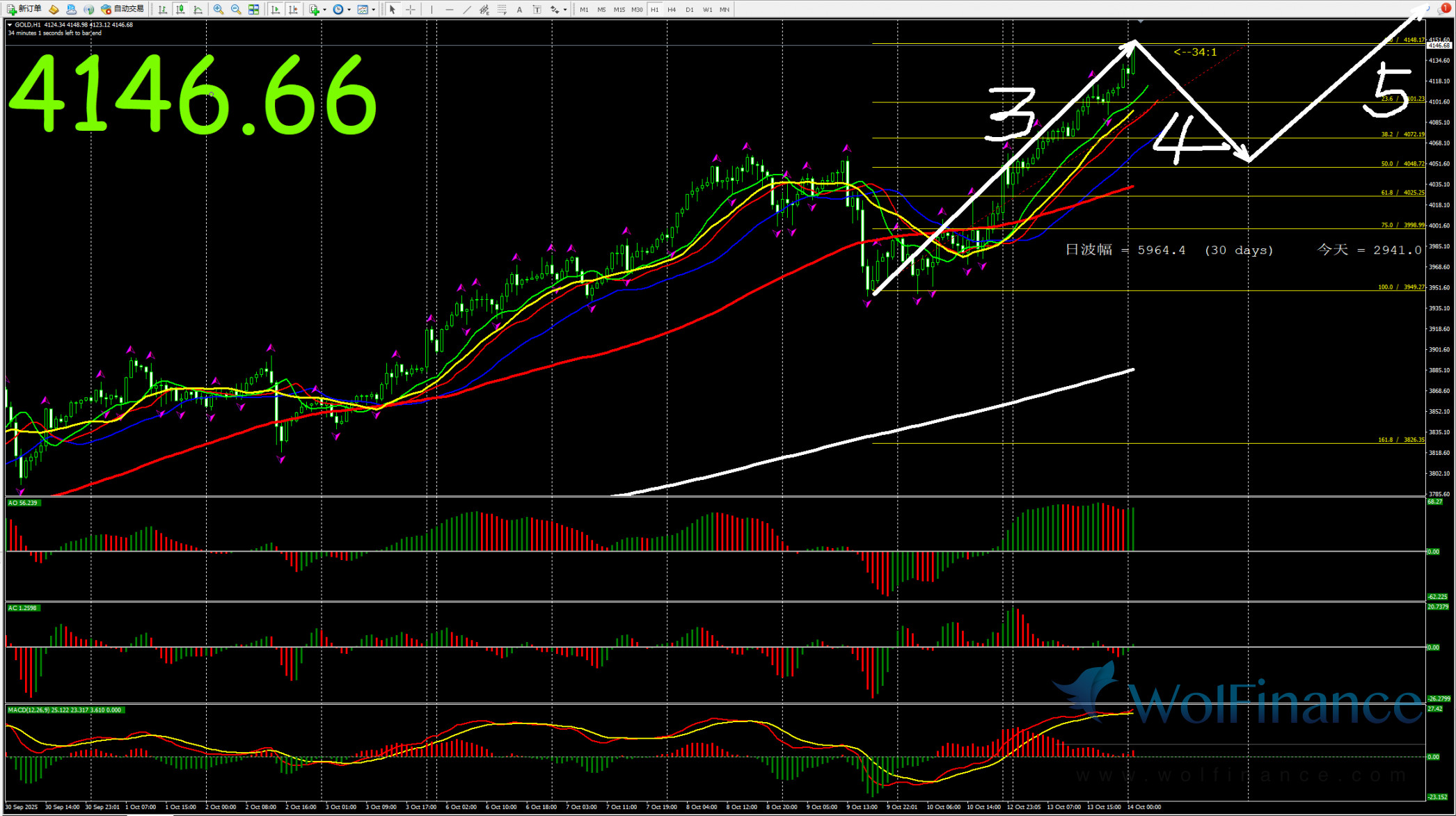 日线级别行情处于3浪行情,关注3浪行情走势,在日线图中关注压力倾向在日线图4160一线附近;支撑倾向在日线图50%(3730);61.8%(3640);四小时行情处于3浪状态,关注3浪的行情走势。支撑倾向在3810附近。1小时图AO零轴上绿色,AC零轴上绿色,代表在小时图中,行情倾向隔夜小时图处在3浪行情,目前在小时图中关注3浪的行情走势,下方支撑3810附近。在1小时图中,行情上涨压力关注4160附近。