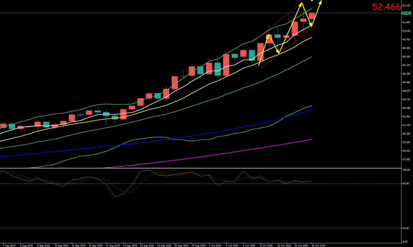 白银周二(10.14)最高试探53.45美元/盎司,最低触及50.44美元元/盎司。收盘于51.32美元/盎司。周三(10.15)开于51.35美元/盎司,截至目前最高上探至52.48元/盎司,最低试探至51.23,现报52.47美元/盎司附近.