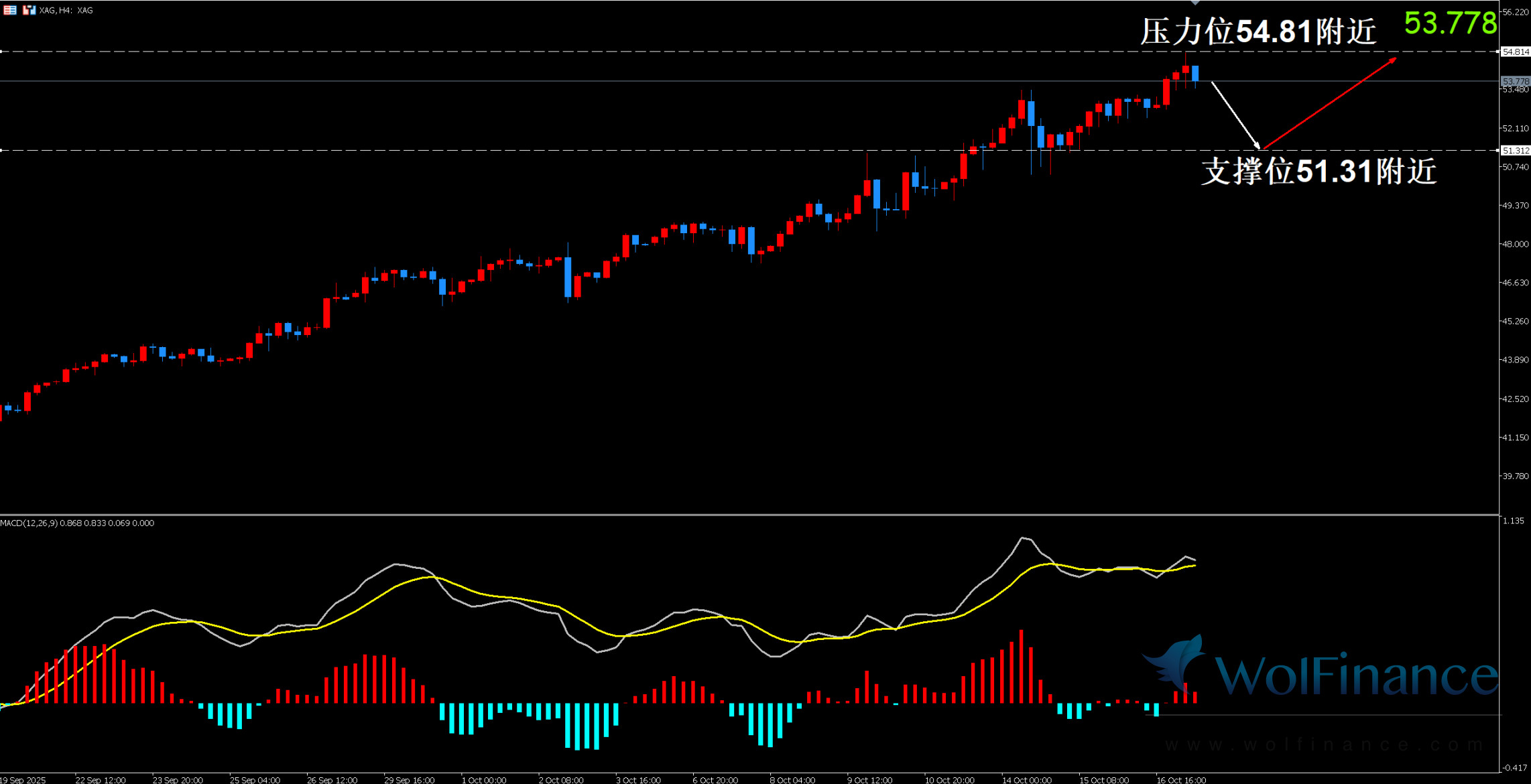 从技术面来看,白银日线图显示,价格在54.80美元附近形成阶段性顶部后出现调整迹象。短线支撑位位于53.50美元区域,该水平为近期上升趋势的关键防线。若跌破此位,价格或进一步回测52.80美元;反之,如能重新企稳54美元上方,则可能重启升势挑战55美元关口。技术指标MACD高位死叉,显示短线动能减弱;RSI自超买区回落至65附近,表明市场进入温和整理阶段。