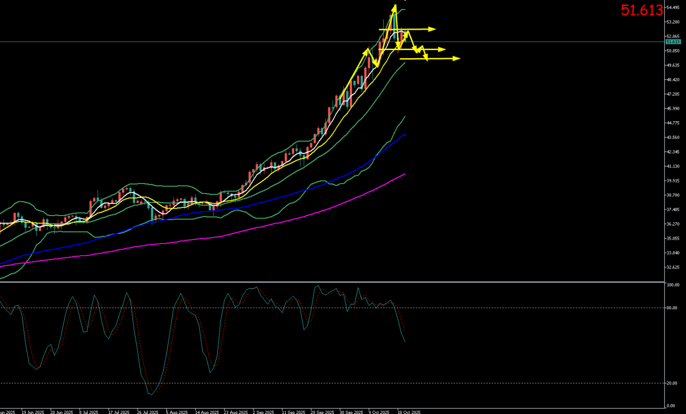 白银周一(10.20)最高试探52.82美元/盎司,最低触及50.9美元元/盎司。收盘于52.21美元/盎司。周二(10.21)开于52.19美元/盎司,截至目前最高上探至52.63元/盎司,最低试探至51.56,现报51.83元/盎司附近.