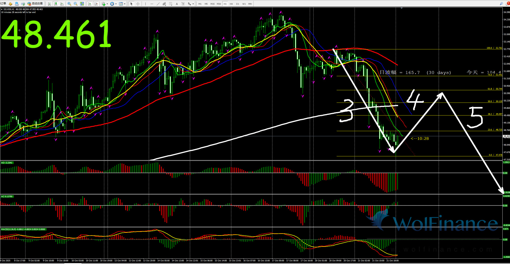 日线图目前处在3浪之中,关注3浪的行情走势。压力倾向在日线图52.70一线附近;支撑倾向在日线图50%(45.80)和61.8%(43.80)一线附近;四小时行情处在4浪走势;并关注上方压力52.70一线附近;1小时图AO零轴下绿色;AC零上绿色,行情在小时图356日线之下运行;小时图关注52.70附近的压力;所以今日关注1小时图震荡行情。