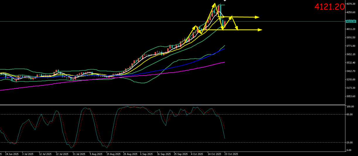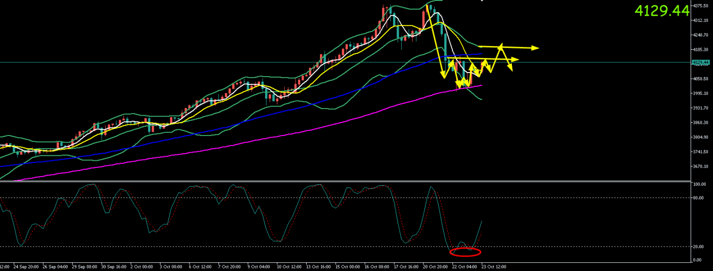 黄金周三(10.22)最高上探至4163.72美元/盎司,最低触及4002.91美元/盎司。收盘于4095.93美元/盎司,周四(10.23)开于4095.15元/盎司,截至目前最高上探至4116.43美元/盎司,最低触及4064.66美元/盎司,小幅反弹,现报价4121.9。