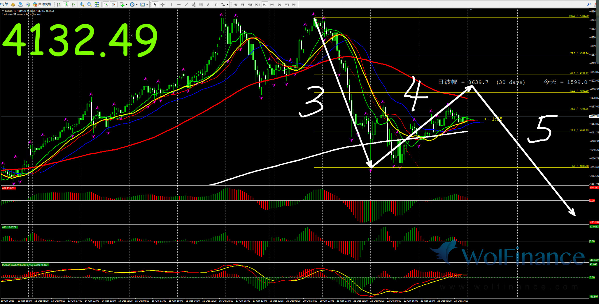 日线级别行情处于3浪行情,关注3浪行情走势,在日线图中关注压力倾向在日线图4286一线附近;支撑倾向在日线图50%(3845);61.8%(3719);四小时行情处于4浪状态,关注4浪的行情走势。支撑倾向在3970附近。1小时图AO零轴上红色,AC零轴下绿色,代表在小时图中,行情倾向隔夜小时图处在3浪行情,目前在小时图中关注4浪的行情走势,下方支撑3970附近。在1小时图中,行情上涨压力关注4230附近。