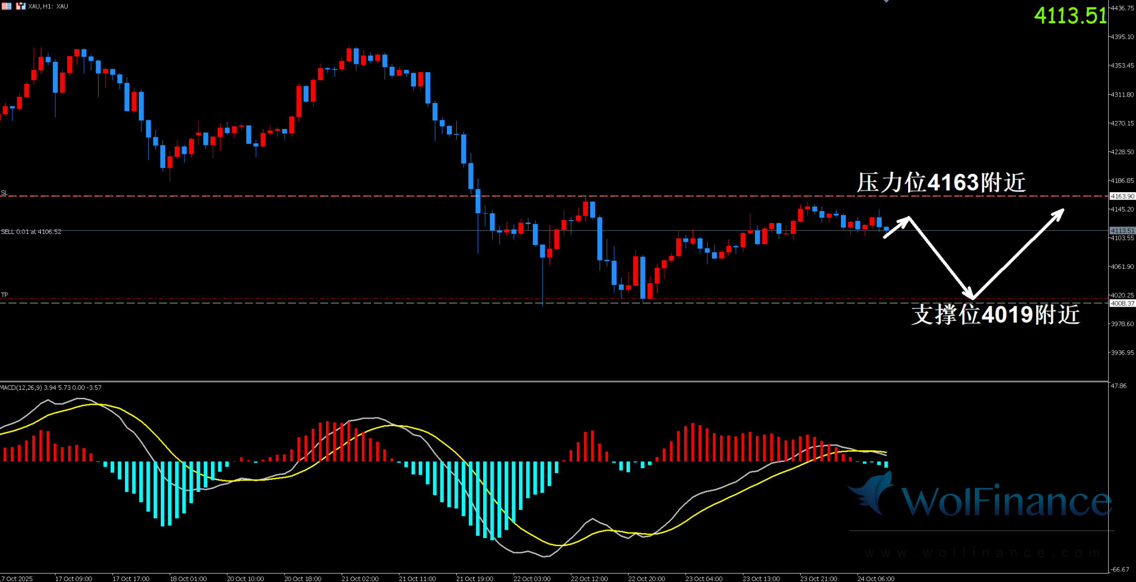 1. 黄金技术显示目前K线在支撑位附近运行,小时图周期为行情价格盘整,下方支撑4010
