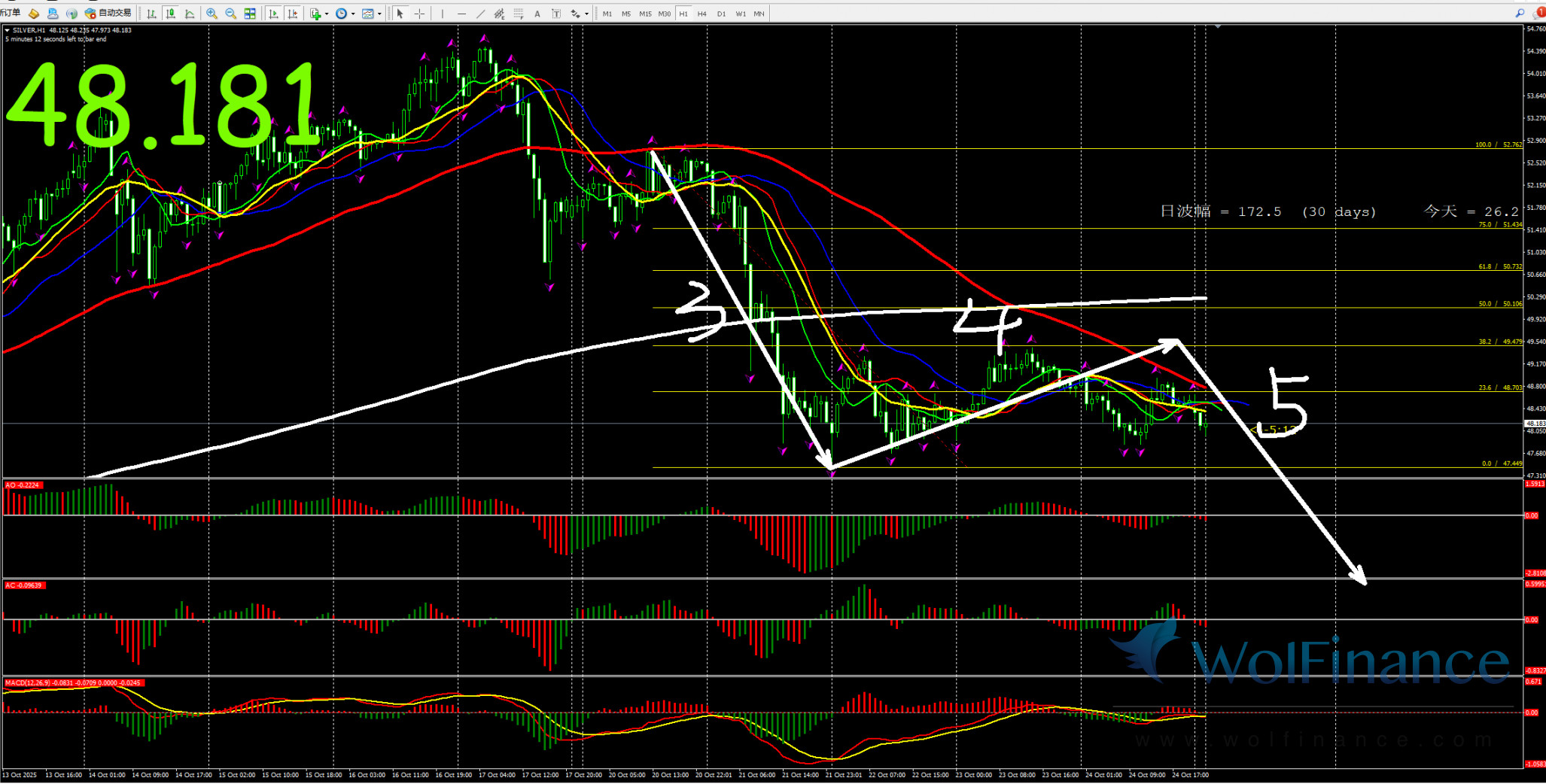 日线图目前处在3浪之中,关注3浪的行情走势。压力倾向在日线图52.70一线附近;支撑倾向在日线图50%(45.80)和61.8%(43.80)一线附近;四小时行情处在4浪走势;并关注上方压力52.70一线附近;1小时图AO零轴下红色;AC零下红色,行情在小时图356日线之下运行;小时图关注52.70附近的压力;所以今日关注1小时图震荡行情。