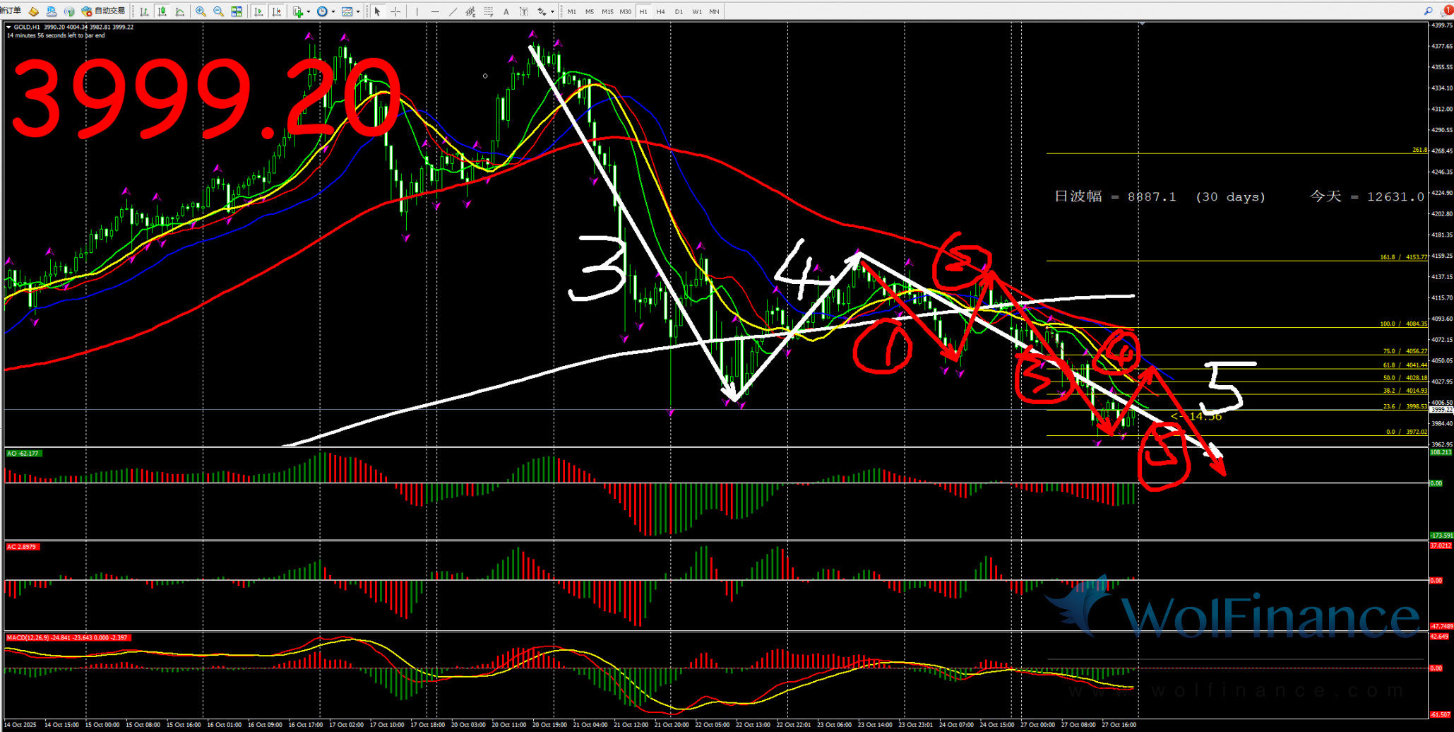 日线级别行情处于3浪行情,关注3浪行情走势,在日线图中关注压力倾向在日线图4286一线附近;支撑倾向在日线图50%(3845);61.8%(3719);四小时行情处于4浪状态,关注4浪的行情走势。支撑倾向在3930附近。1小时图AO零轴下绿色,AC零轴上红色,代表在小时图中,行情倾向隔夜小时图处在5浪行情,目前在小时图中关注5浪的行情走势,下方支撑3930附近。在1小时图中,行情上涨压力关注4230附近。