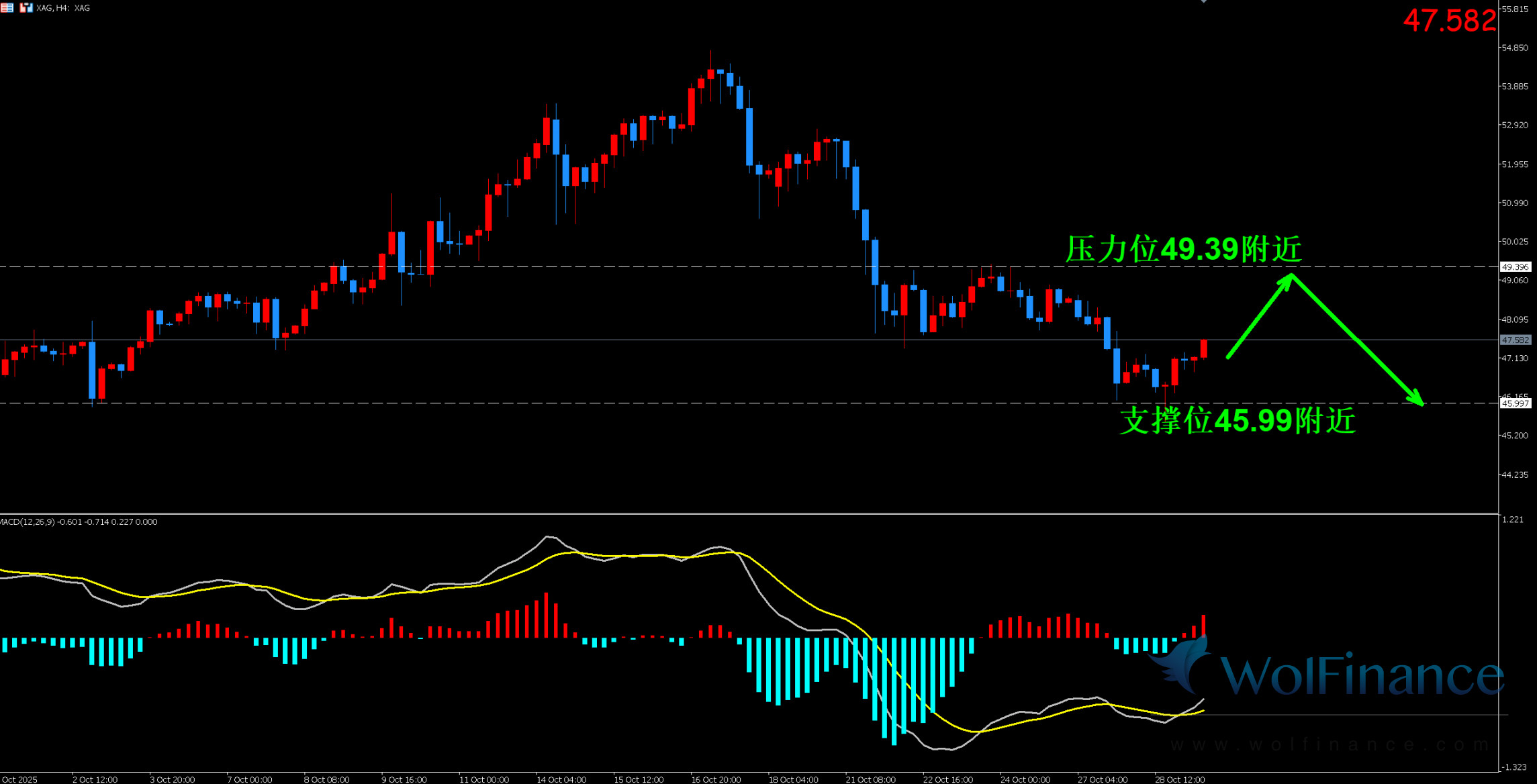 1. 白银技术图表显示目前K线支撑位46.00附近