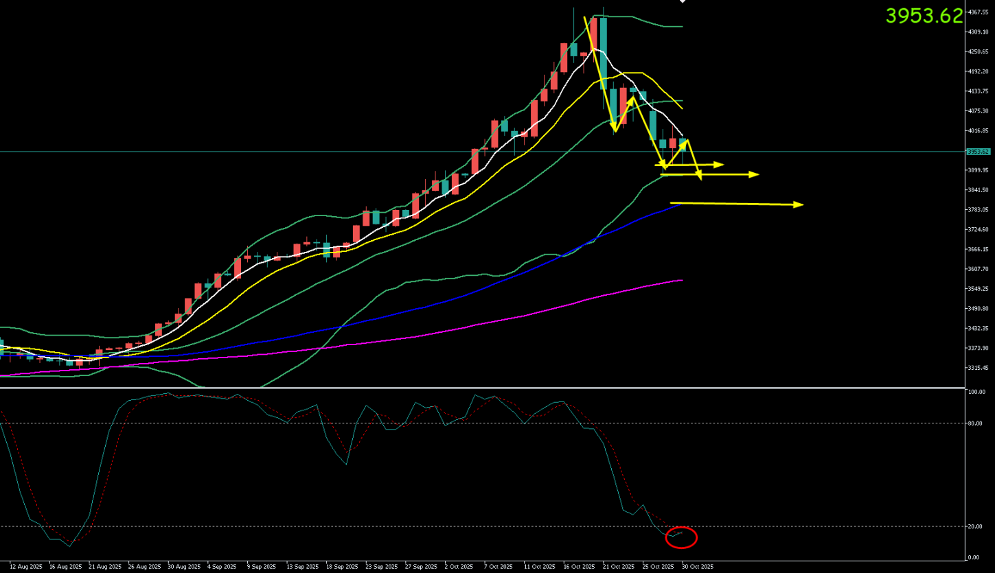 黄金周三(10.29)最高上探至4019.43美元/盎司,最低触及3886.23美元/盎司。收盘于3928.35美元/盎司,周四(10.30)开于3930.99.元/盎司,截至目前最高上探至3982.88美元/盎司,最低触及3915.33美元/盎司,黄金早间二次探底回升,现报价3970.3。