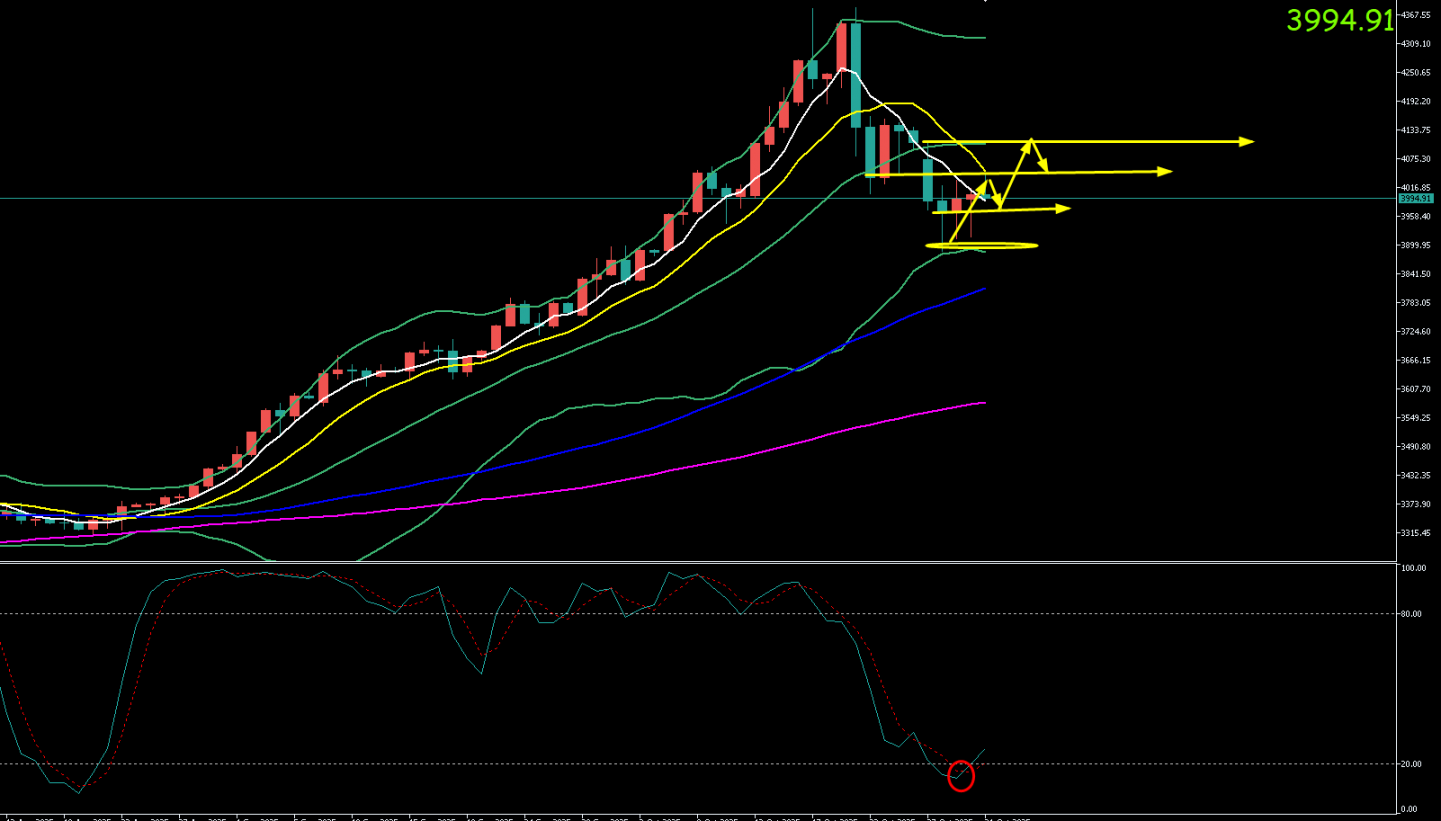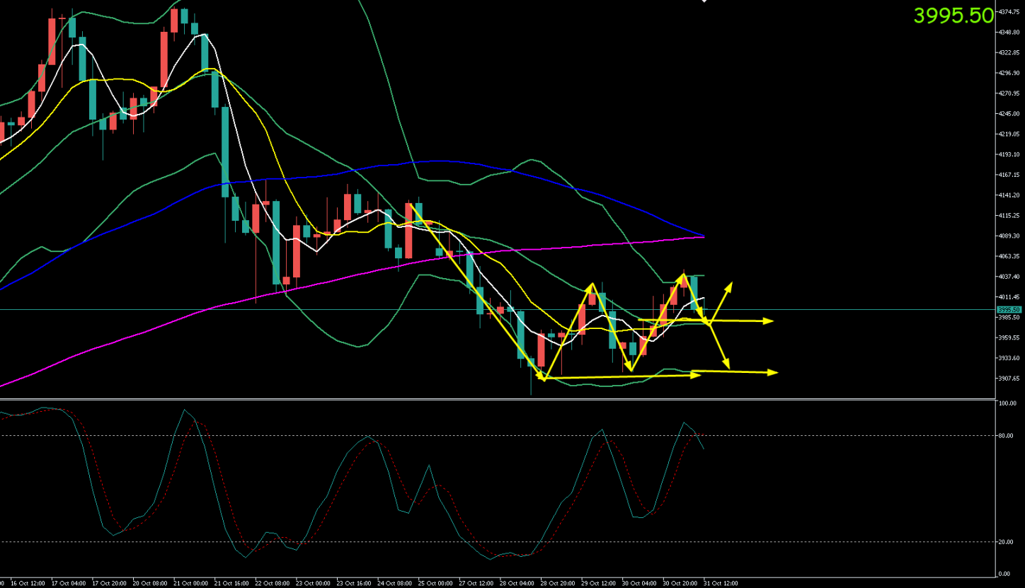 黄金周四(10.30)最高上探至4046.36美元/盎司,最低触及3914.15美元/盎司。收盘于4024.21美元/盎司,周五(10.31)开于4024.41元/盎司,截至目前最高上探至4046.29美元/盎司,最低触及3990.49美元/盎司,黄金早间小时线级别回踩,现报价4003.7。