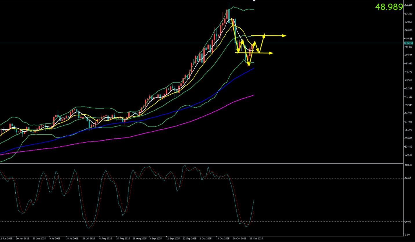 白银日线级别价格反弹站稳日5MA一线,并又迹象再次上探日布林中轨附近压力。日线级别价格偏多运行。4小时周期价格上探至4小时60MA附近,并回踩4小时5MA未有效突破。4小时级别下方形成头肩底结构。亚欧盘关注价格在60MA附近得表现-48.84附近。若欧盘价格企稳60MA之上则偏多试探上方50关口。反之价格若再度跌破该位置则有概率回踩4小时布林中轨附近支撑47.8附近。白银关注欧盘回踩节奏是否成立,回落做多为主。高空为辅。