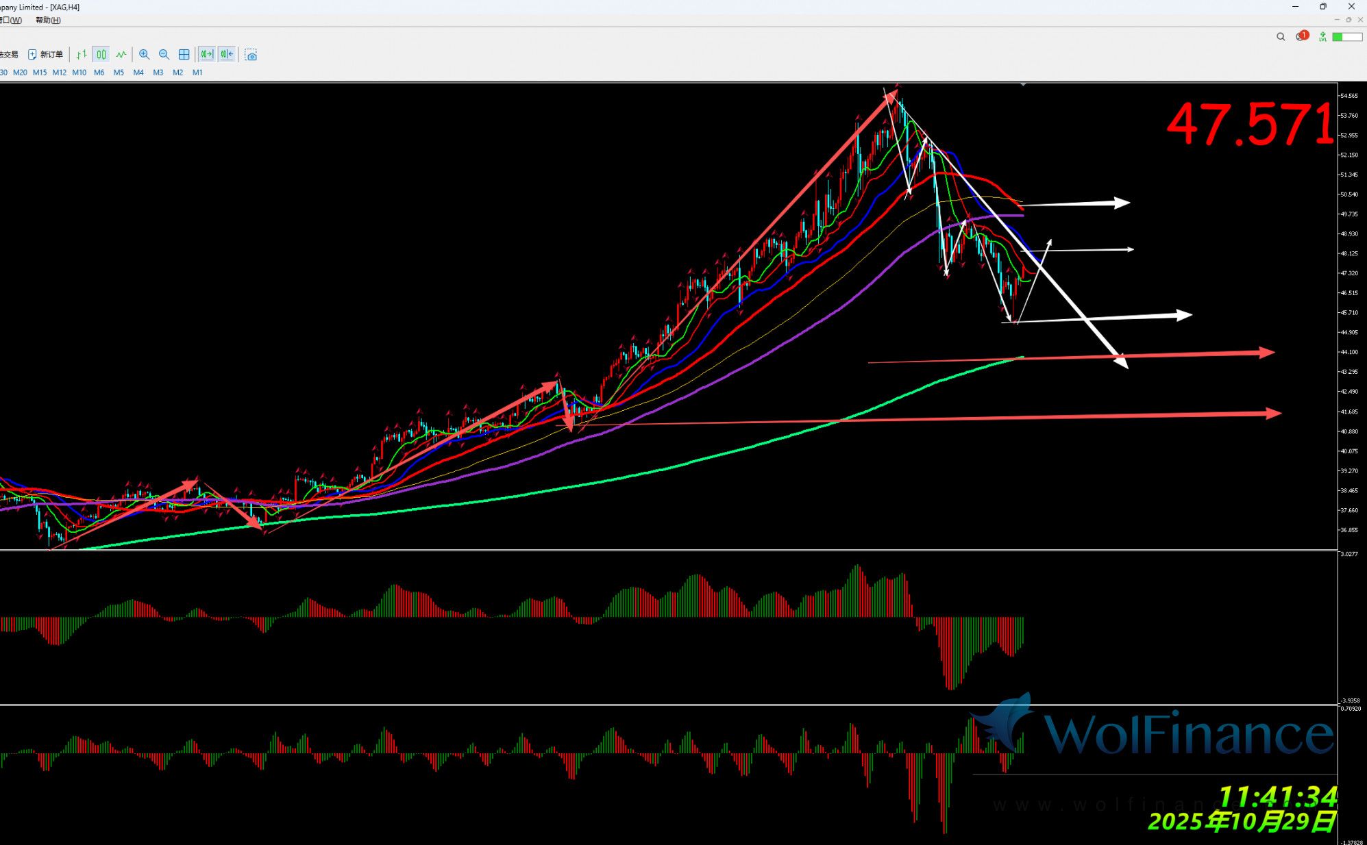解析:日线AO红色,AC绿色,日线鳄鱼线缠绕;4小时AO红色,AC红色,鳄鱼线缠绕向上;银价上周五继续创出新高目前至40.481附近,12H图上看目前银价走得是主三浪上涨走势中理论上方关注50.13-52.34目标预期;银价自12H的120均线两次企稳后再次上涨,4H自36.95低点涨至43.04后回调至60均线下方41.14后再次上涨至当下48.69,从浪形上看银价目前判定为4小时的5-5浪预期的上涨预期中,上涨的最低标准反转线为2小时的蓝色线的蓝色线和60均线之间,上周银价跌破2小时的60均线判定为5-4浪调整,银价冲击51.21后回落至2小时的蓝色线和60均线上方在48.38-51.21之间偏多震荡后再次涨至54.77后冲高回落且跌破了2小时的60均线和蓝色线至2小时的120均线附近后反弹,银价跌破了2小时的60均线后打坏了上涨结构且1小时银价跌破120均线是故目前判定银价在1小时和30分钟上属于主跌浪,银价最低跌破2小时的356均线至12小时的89均线和8小时的14均线后反弹,15分钟上完成下跌完整的5-5浪结构后反弹,目前从45.54后反弹至47.54附近,这段上涨判定为15分钟的A浪反弹48.45高点后回落1小时的60均线后再次起涨至49.35-49.55-50.21-50.60-50.97压力预期。