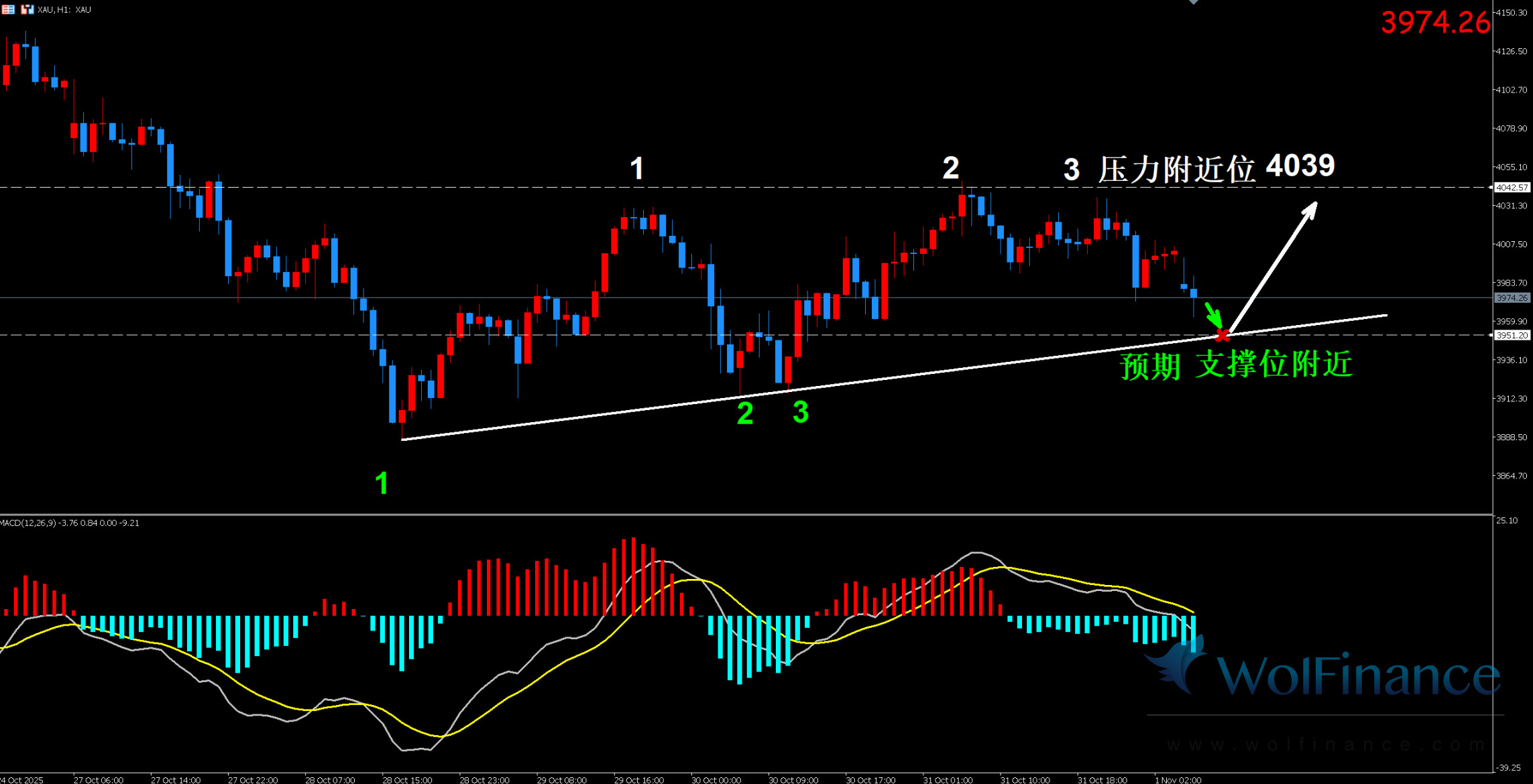 1. 黄金技术图表显示目前K线支撑位3952附近