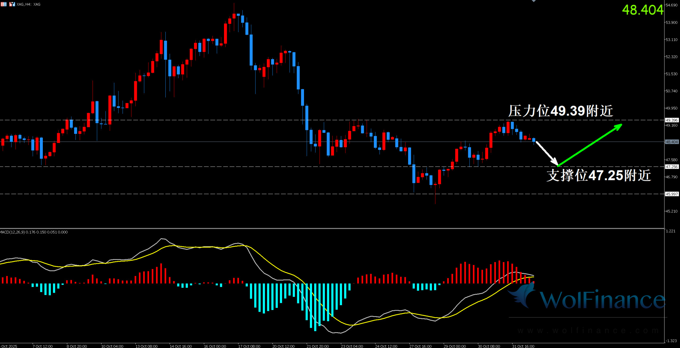 1. 白银技术图表显示目前K线支撑位46.98附近