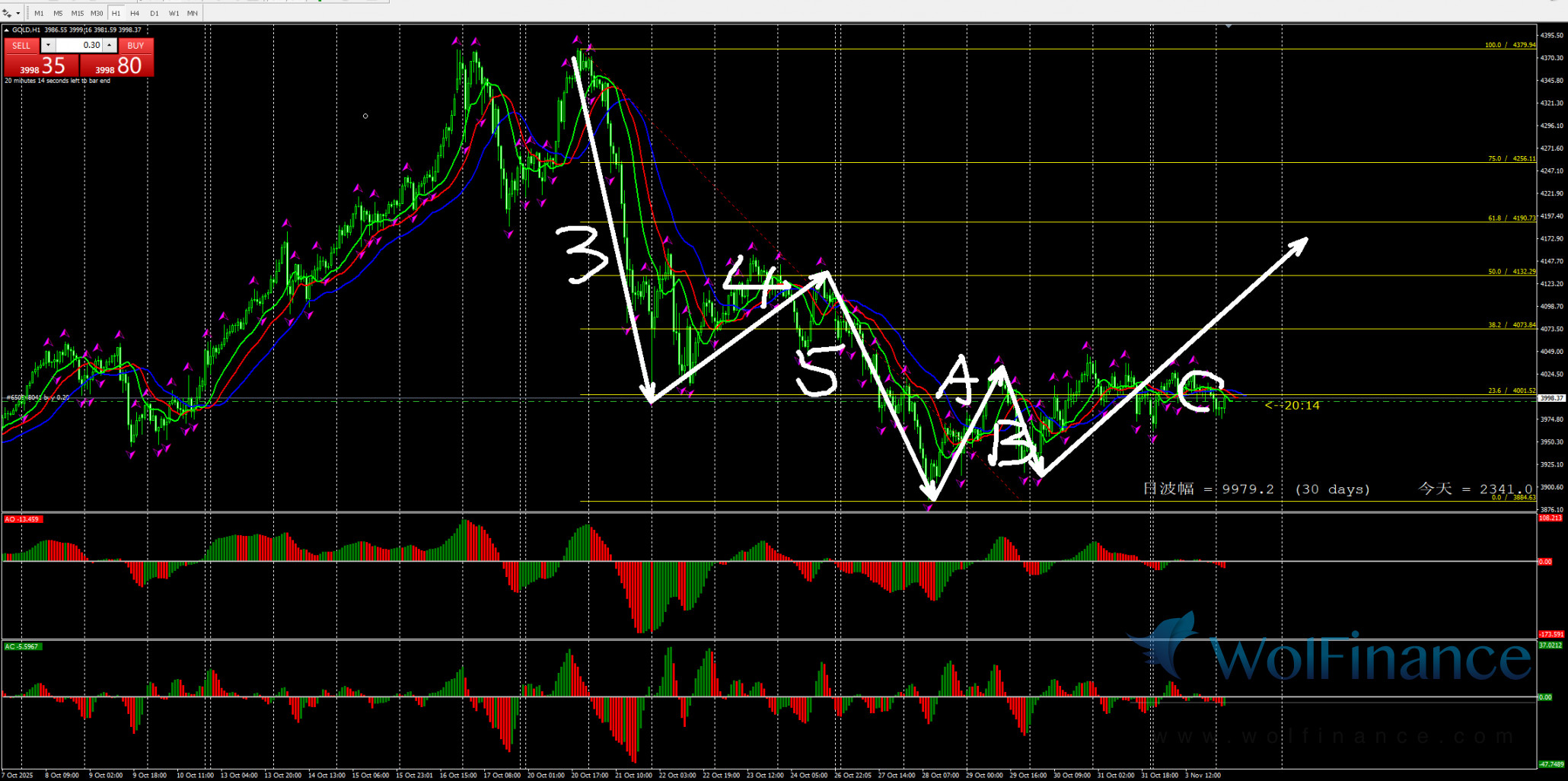 日线级别行情处于4浪行情,关注4浪行情走势,在日线图中关注压力倾向在日线图4230一线附近;支撑倾向在日线图50%(3845);61.8%(3719);四小时行情处于4浪状态,关注4浪的行情走势。支撑倾向在3900附近。1小时图AO零轴下红色,AC零轴下红色,代表在小时图中,行情倾向隔夜小时图处在C浪行情,目前在小时图中关注C浪的行情走势,下方支撑3900附近。在1小时图中,行情上涨压力关注4230附近。
