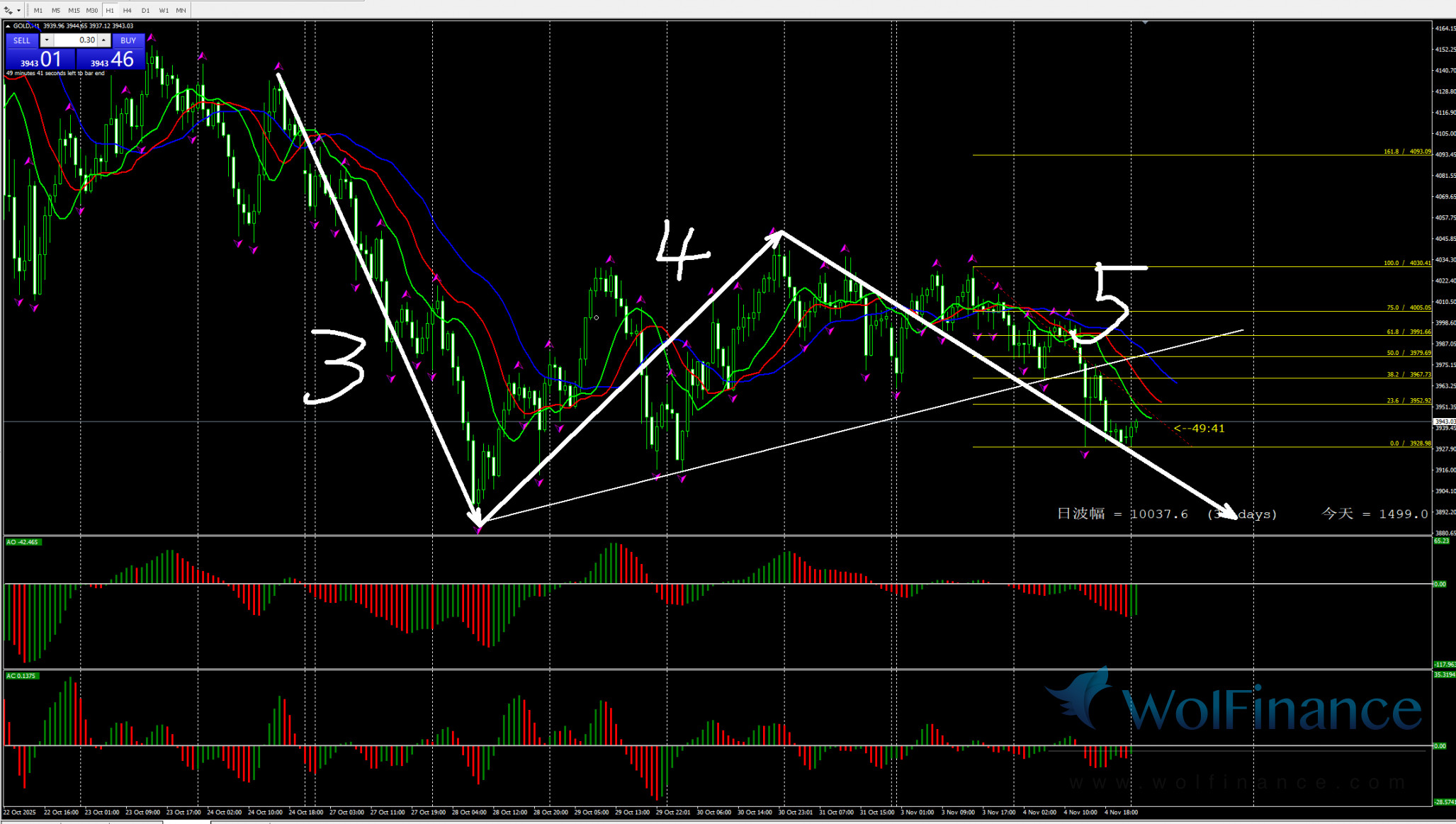 日线级别行情处于4浪行情,关注4浪行情走势,在日线图中关注压力倾向在日线图4130一线附近;支撑倾向在日线图50%(3845);61.8%(3719);四小时行情处于4浪状态,关注4浪的行情走势。支撑倾向在3850附近。1小时图AO零轴下绿色,AC零轴下绿色,代表在小时图中,行情倾向隔夜小时图处在C浪行情,目前在小时图中关注C浪的行情走势,下方支撑3850附近。在1小时图中,行情上涨压力关注4130附近。
