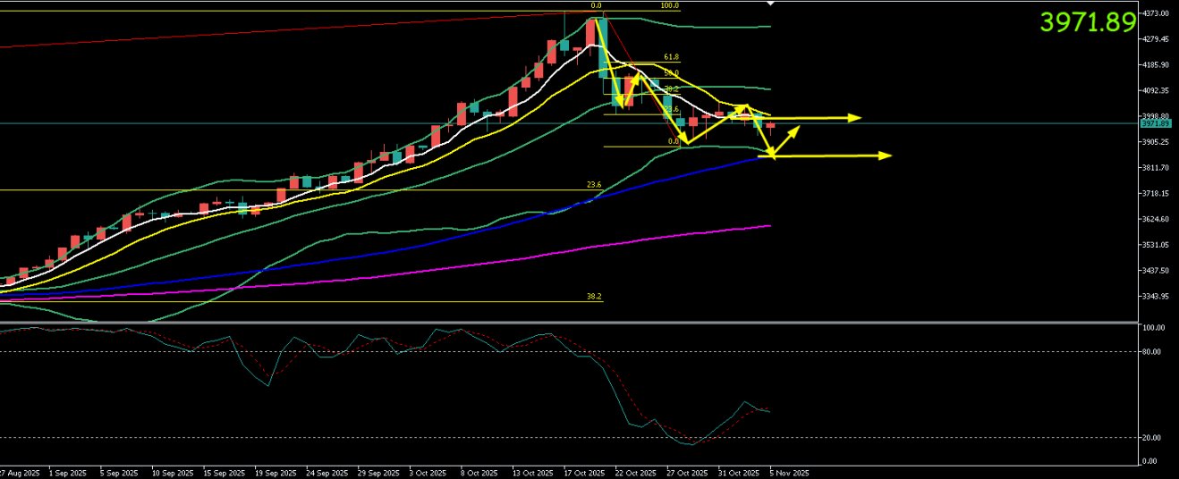 黄金周二(11.4)最高上探至4009.8美元/盎司,最低触及3928.03美元/盎司。收盘于3930.81美元/盎司,周四(11.5)开于3933.59元/盎司,截至目前最高上探至3978.54美元/盎司,最低触及3928.96美元/盎司,黄金早间4小时级别强势反弹,现报价3966。