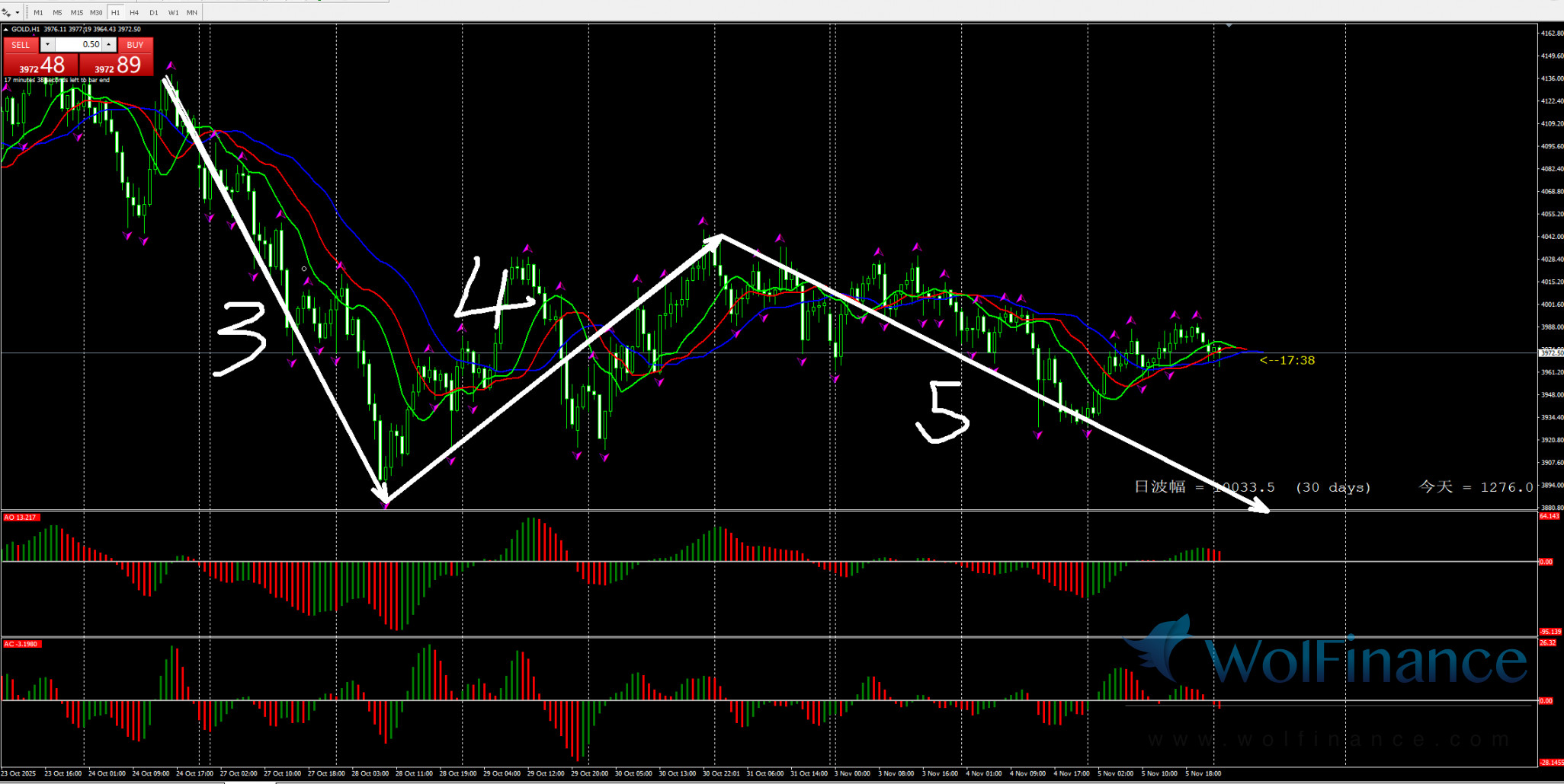 日线级别行情处于4浪行情,关注4浪行情走势,在日线图中关注压力倾向在日线图4130一线附近;支撑倾向在日线图50%(3845);61.8%(3719);四小时行情处于4浪状态,关注4浪的行情走势。支撑倾向在3850附近。1小时图AO零轴上红色,AC零轴下红色,代表在小时图中,行情倾向隔夜小时图处在C浪行情,目前在小时图中关注C浪的行情走势,下方支撑3850附近。在1小时图中,行情上涨压力关注4130附近。