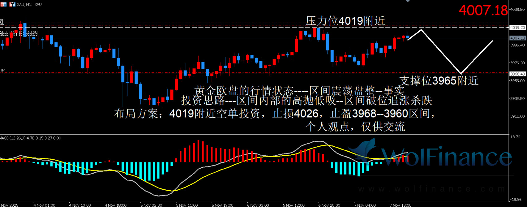 周五(11月7日)金价欧盘反弹测试前高,压力位承压空单布局方案。,目前交投于4011美元/盎司附近。周四金价上演了一出“冲高回落”的惊险大戏,早盘一度强势拉升近1%,直逼4020美元/盎司关口,最高触及4019.44美元/盎司的亮眼高点,却在纽约时段戛然而止,全线回吐涨幅,最终收于3976.85美元/盎司,几乎与前一交易日持平。这波震荡行情是美国政府史上最长停摆、特朗普关税政策合法性疑云笼罩,以及疲软劳动力市场数据等多重不确定性交织而成的结果。一方面,避险资金蜂拥而入,推动金价短暂上扬;另一方面,美股全线暴跌的拖累效应,让投资者转向现金避险,黄金的辉煌瞬间化为泡影。面对这一幕,市场不禁发问:在美联储降息预期升温的背景下,黄金的年底冲刺还能否重拾涨势?