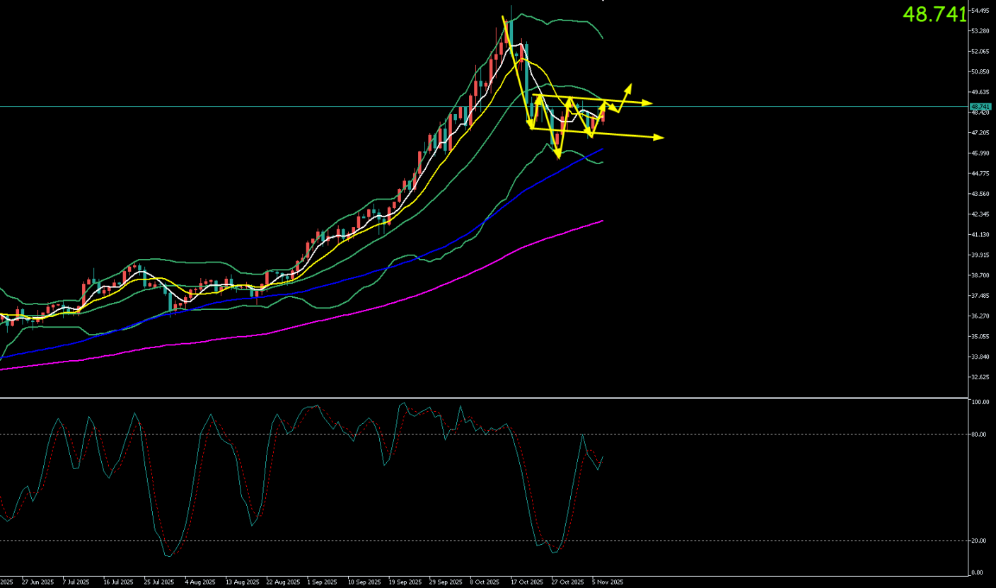 白银周四(11.6)最高试探48.78美元/盎司,最低触及47.64元/盎司。收盘于48.02美元/盎司。周五(11.7)开于47.94美元/盎司,截至目前最高上探至48.87元/盎司,最低试探至47.64,现报48.78元/盎司附近.