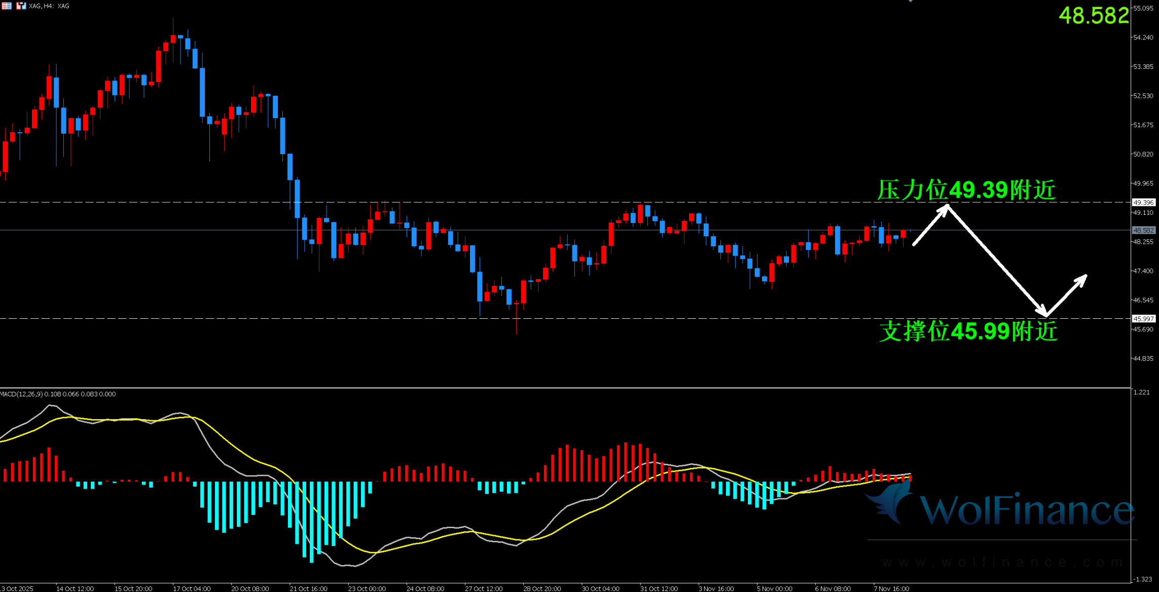 1. 白银技术图表显示目前K线支撑位46.98附近