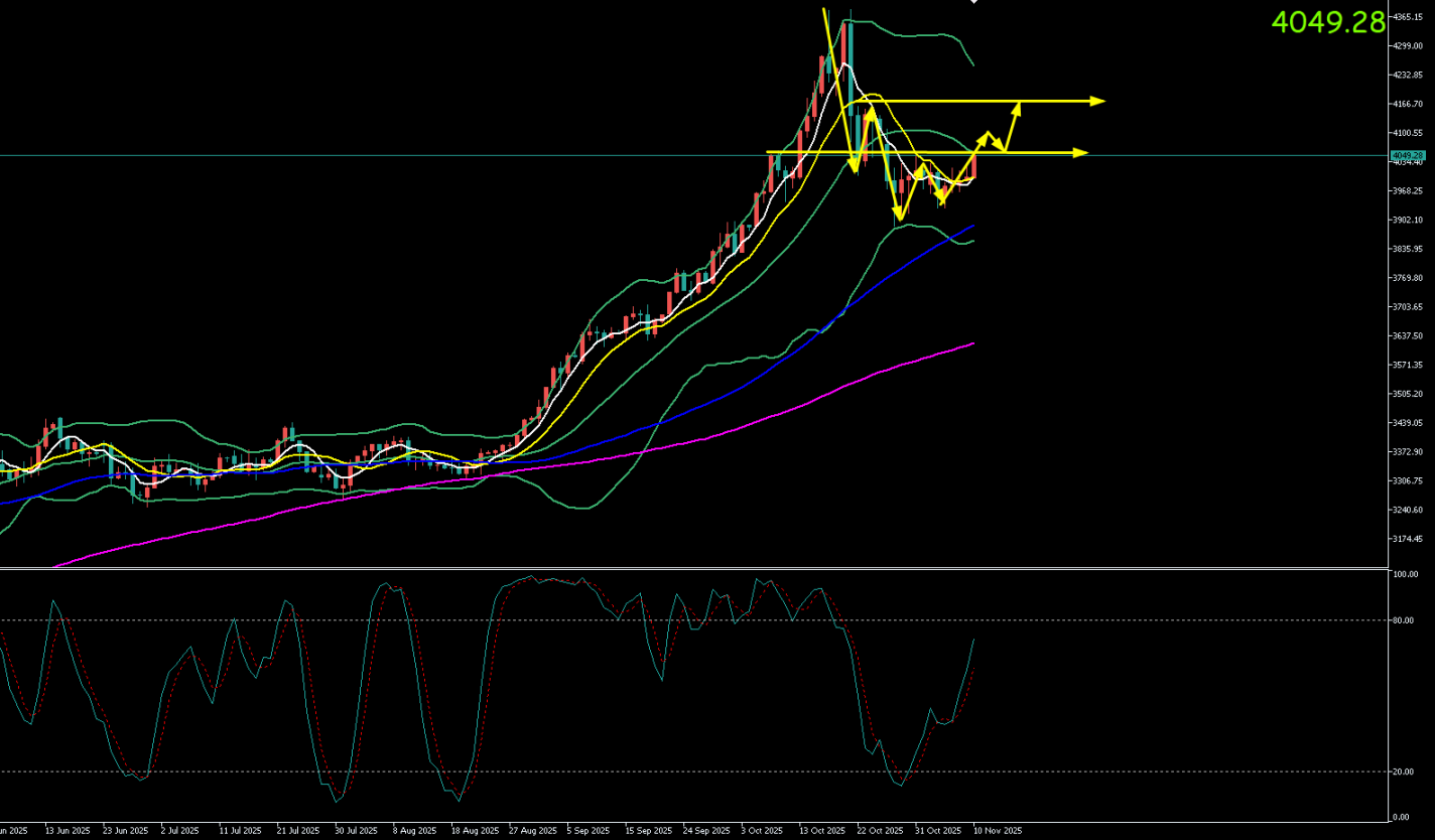 黄金周五(11.7)最高上探至4027.55美元/盎司,最低触及3983.88美元/盎司。收盘于3999.5美元/盎司,周一(11.10)开于3997.79元/盎司,截至目前最高上探至4053.52美元/盎司,最低触及3997.34美元/盎司,黄金早间4小时级别三角形破位上行,现报价4046。