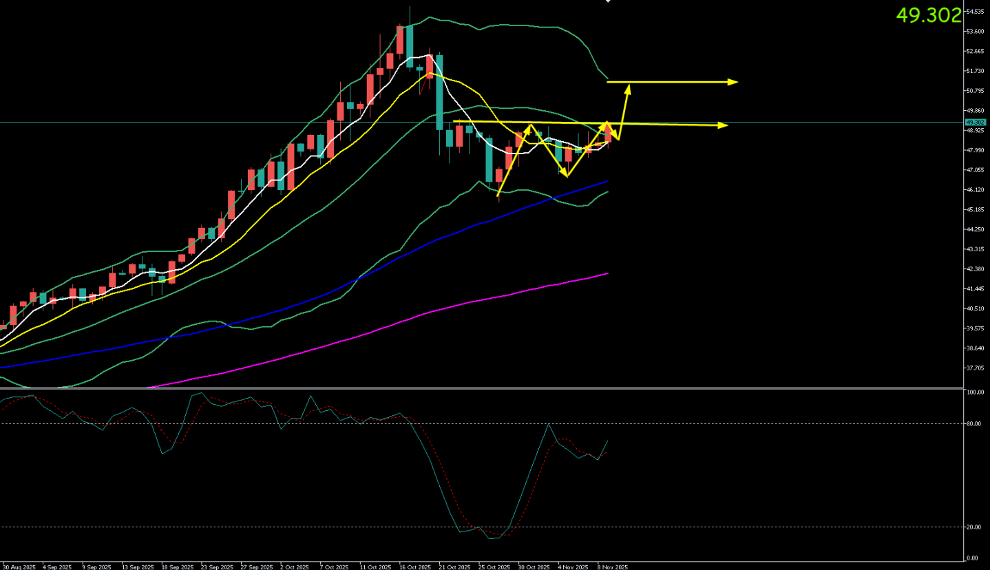 白银日线级别早间强阳突破前期三角形整理形态。早间强势击穿日线布林中轨一线,测试前期头肩底颈线压力49.45附近。若价格站稳49.45之上,则下方头肩底构筑成功,白银将打开进一步上行空间。4小时级别价格短期再次触及上方120MA压力以及关键结构压力49.45附近。午盘操作重点关注该位置得得失。日内操作回落做多为主高空为辅。