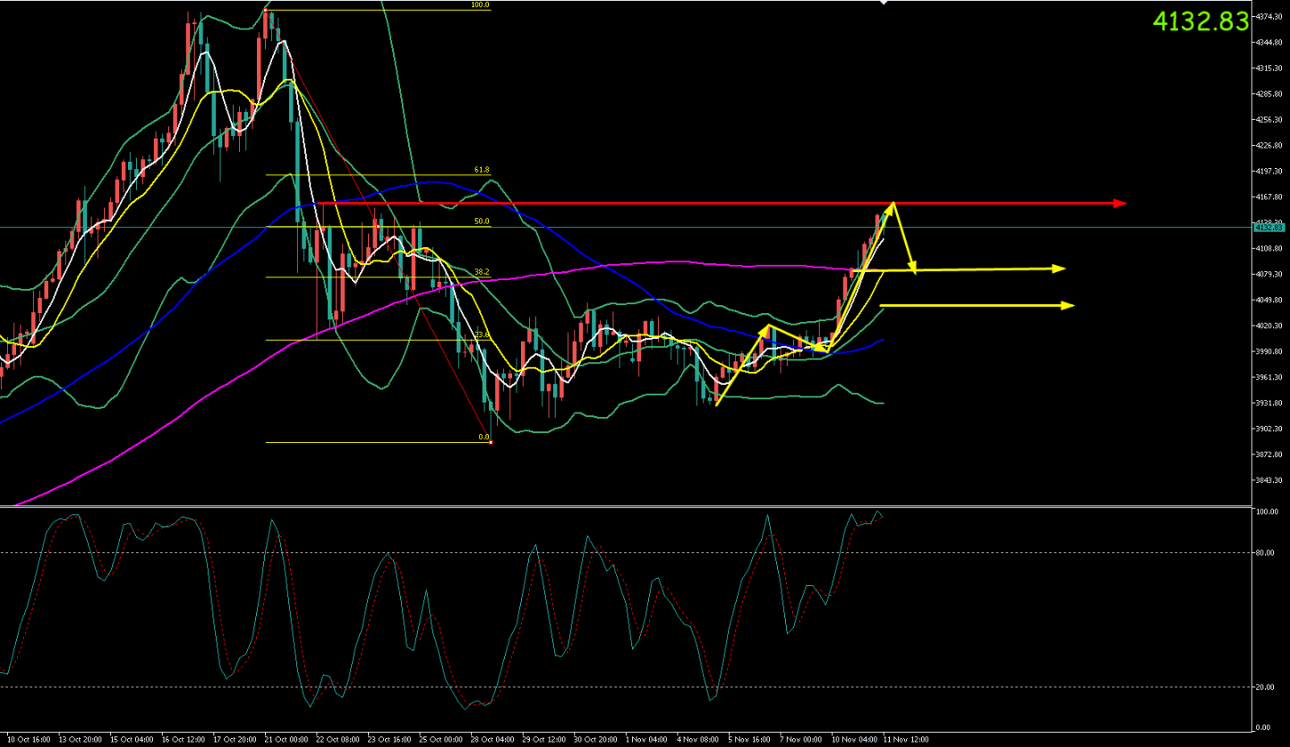 黄金周一(11.10)最高上探至4115.7美元/盎司,最低触及3997.34美元/盎司。收盘于4115.35美元/盎司,周二(11.11)开于4114.63元/盎司,截至目前最高上探至4148.08美元/盎司,最低触及4114.27美元/盎司,黄金早间沿5MA上行,测试压力,现报价4144.83。