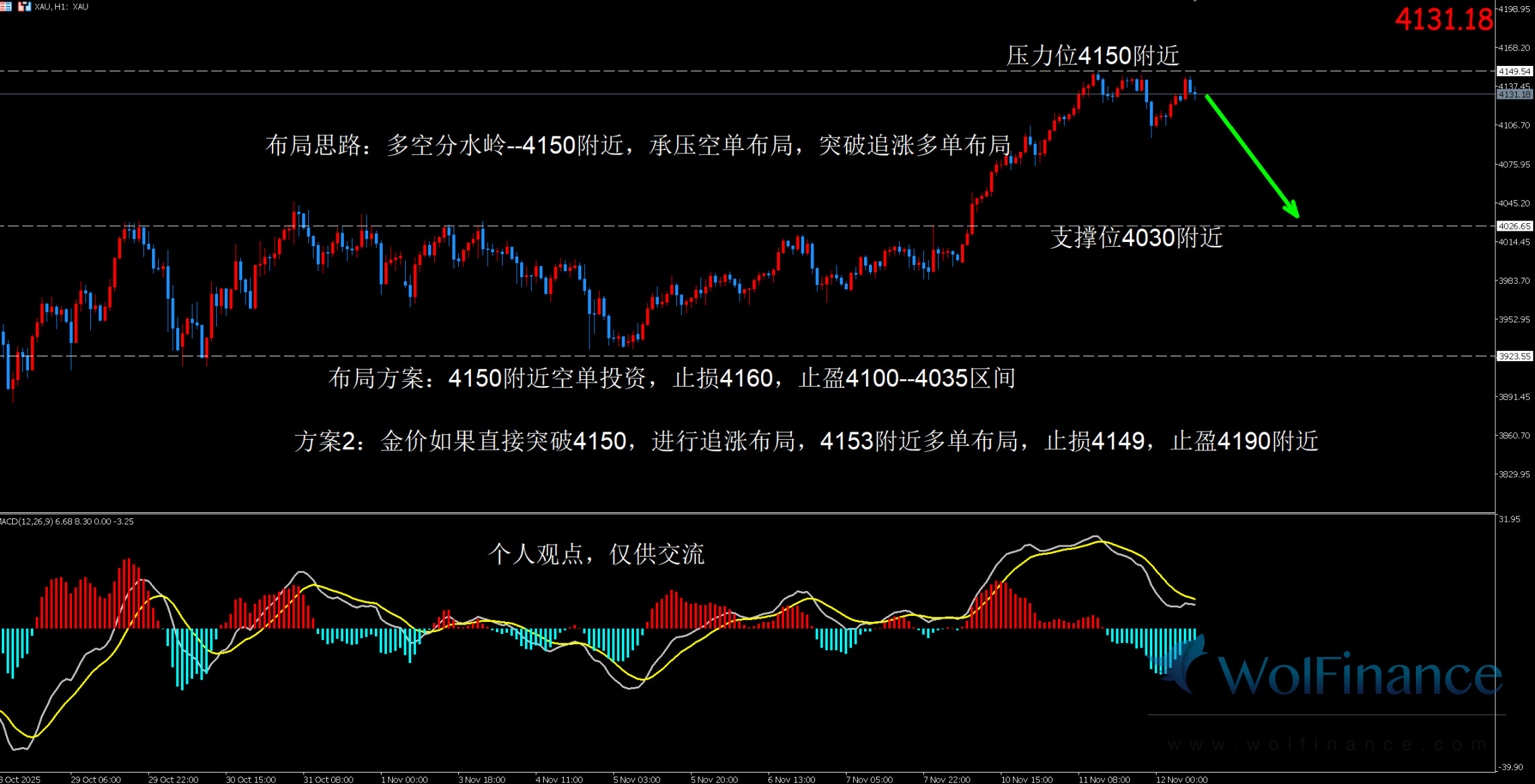 1.布局方案1:4150附近空单布局,止损4160, 止盈4110-----4100区间,