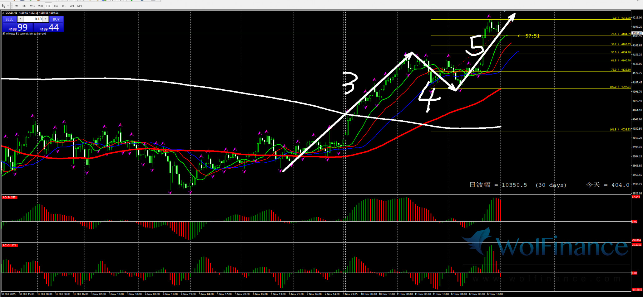 日线级别行情处于4浪行情,关注4浪行情走势,在日线图中关注压力倾向在日线图4210一线附近;支撑倾向在日线图50%(3845);61.8%(3719);四小时行情处于4浪状态,关注4浪的行情走势。支撑倾向在3950附近。1小时图AO零轴上红色,AC零轴下红色,代表在小时图中,行情倾向隔夜小时图处在5浪行情,目前在小时图中关注5浪的行情走势,下方支撑3950附近。在1小时图中,行情上涨压力关注4210附近。