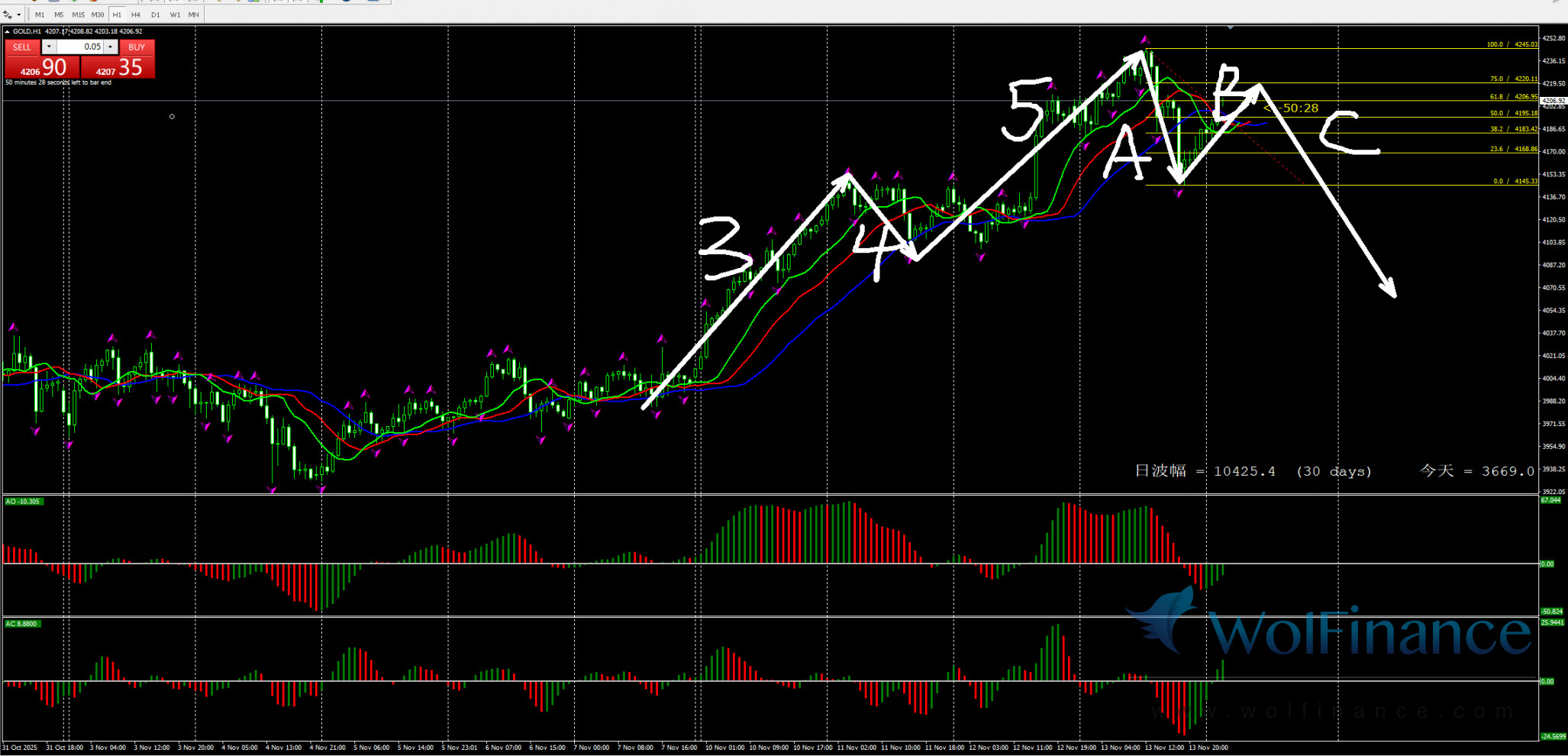 日线级别行情处于4浪行情,关注4浪行情走势,在日线图中关注压力倾向在日线图4250一线附近;支撑倾向在日线图50%(3845);61.8%(3719);四小时行情处于4浪状态,关注4浪的行情走势。支撑倾向在3950附近。1小时图AO零轴下绿色,AC零轴上绿色,代表在小时图中,行情倾向隔夜小时图处在5浪行情,目前在小时图中关注5浪的行情走势,下方支撑3950附近。在1小时图中,行情上涨压力关注4250附近。