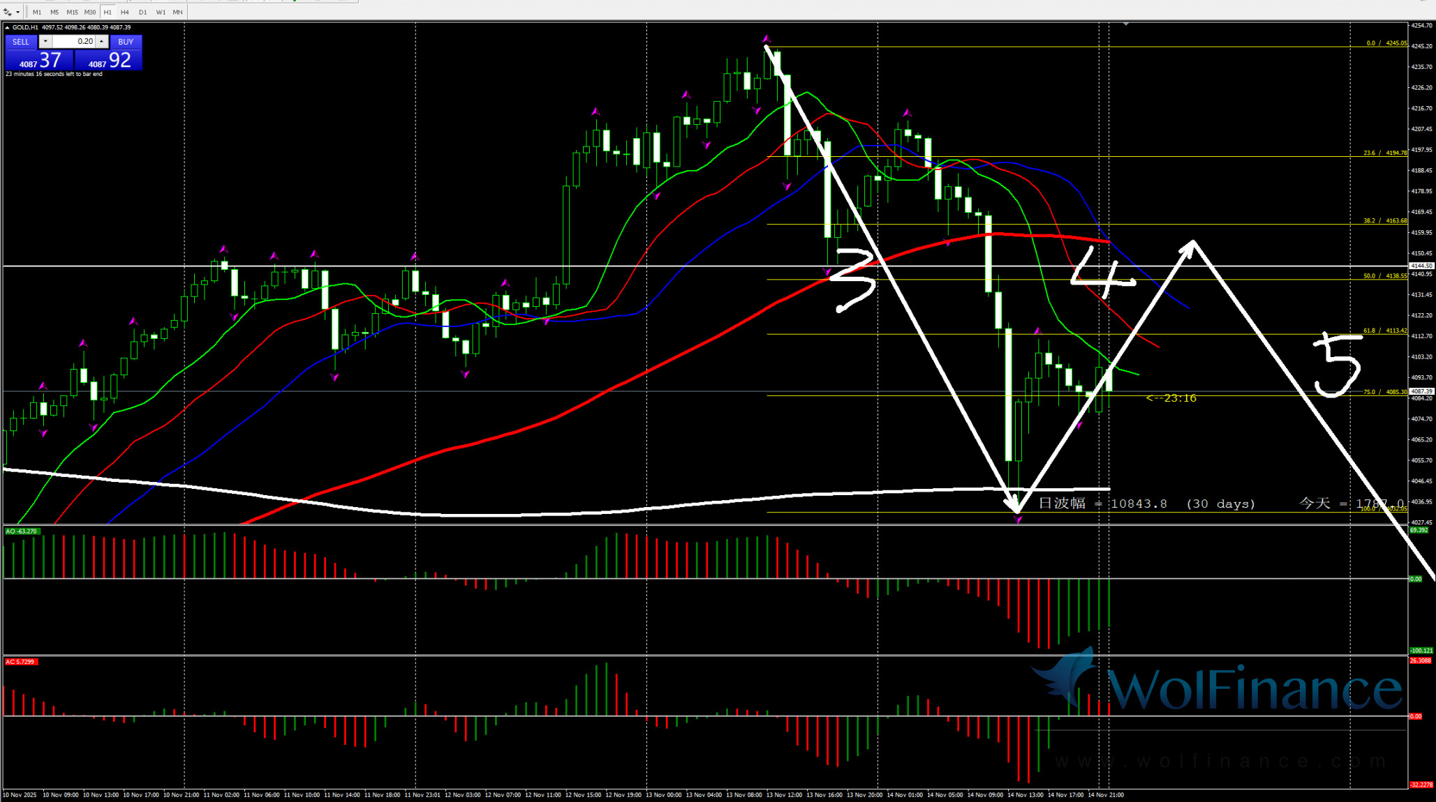 日线级别行情处于4浪行情,关注4浪行情走势,在日线图中关注压力倾向在日线图4250一线附近;支撑倾向在日线图50%(3845);61.8%(3719);四小时行情处于4浪状态,关注4浪的行情走势。支撑倾向在3950附近。1小时图AO零轴下绿色,AC零轴上红色,代表在小时图中,行情倾向隔夜小时图处在3浪行情,目前在小时图中关注3浪的行情走势,下方支撑3950附近。在1小时图中,行情上涨压力关注4250附近。