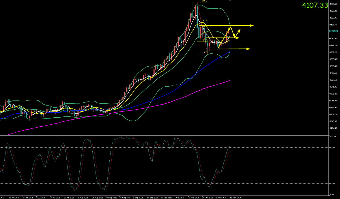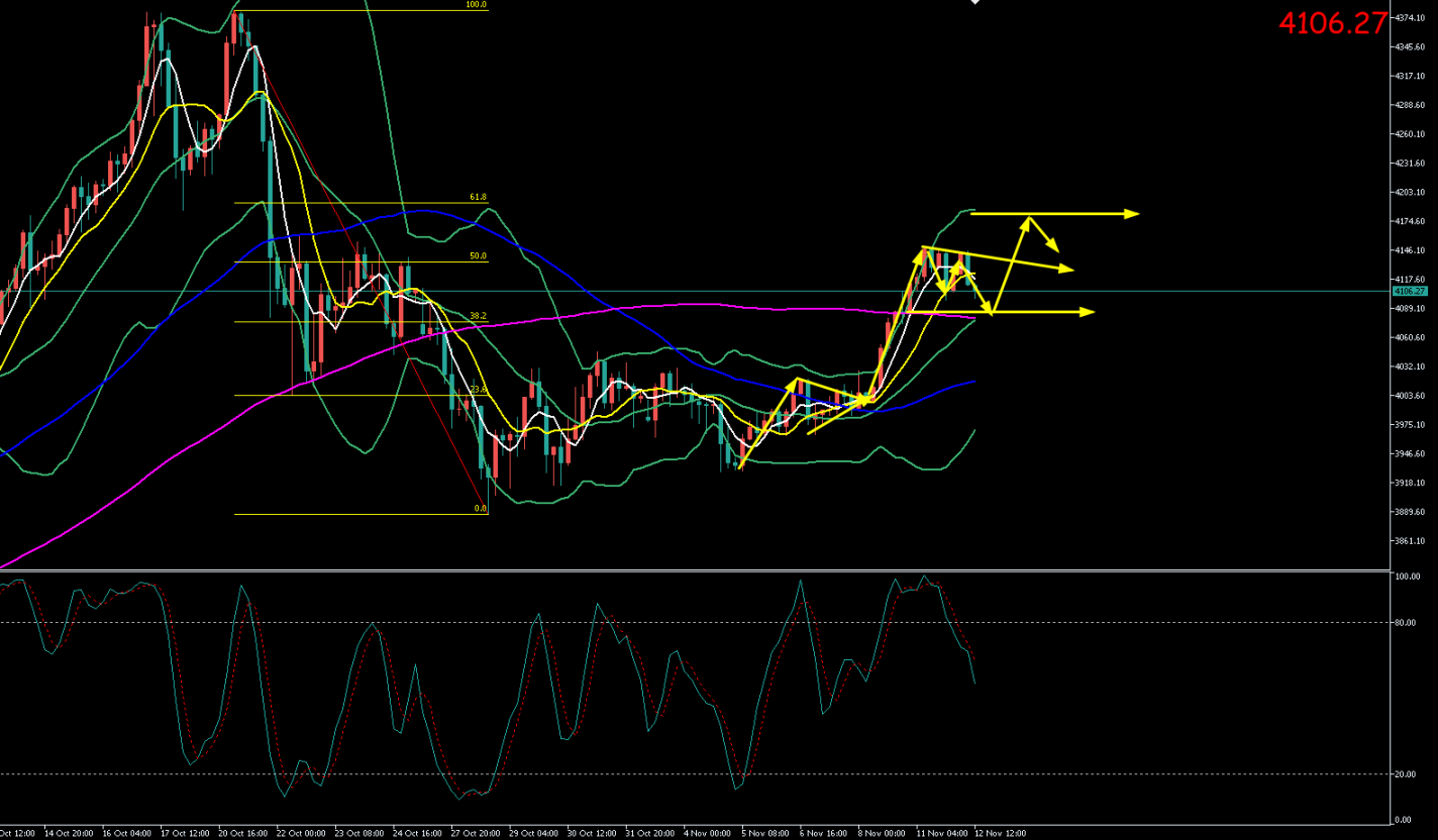 黄金周二(11.11)最高上探至4146.59美元/盎司,最低触及4096.38美元/盎司。收盘于4126.14美元/盎司,周三(11.12)开于4127.05元/盎司,截至目前最高上探至4145.69美元/盎司,最低触及4103.3美元/盎司,黄金小时区间震荡,测试支撑,现报价4108.25。