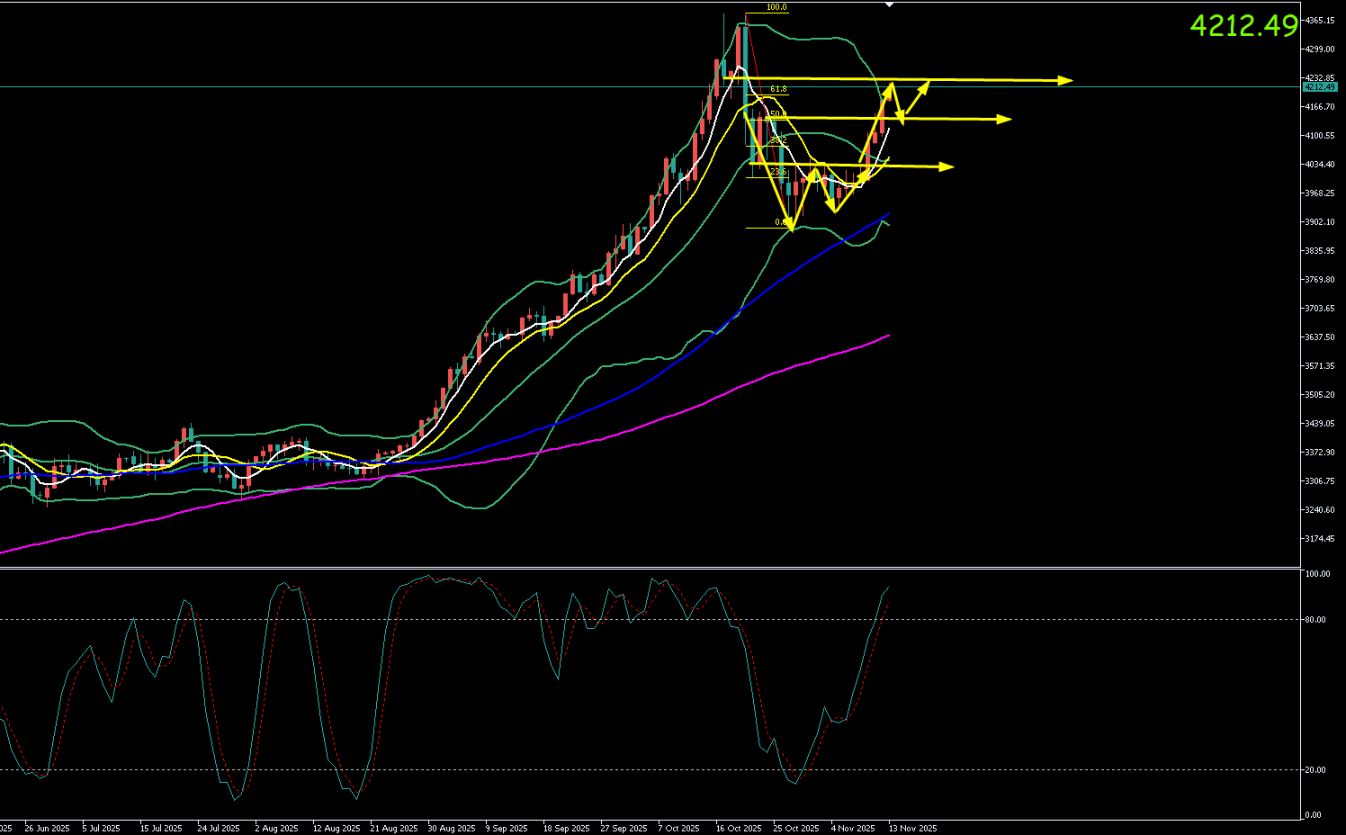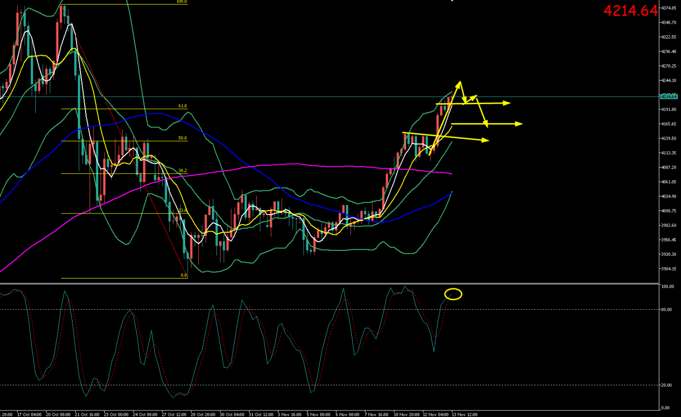 黄金周三(11.12)最高上探至4211.86美元/盎司,最低触及4097美元/盎司。收盘于4194.39美元/盎司,周四(11.13)开于4196元/盎司,截至目前最高上探至4219.4美元/盎司,最低触及4179.73美元/盎司,黄金4小时级别震荡上行,现报价4216.8