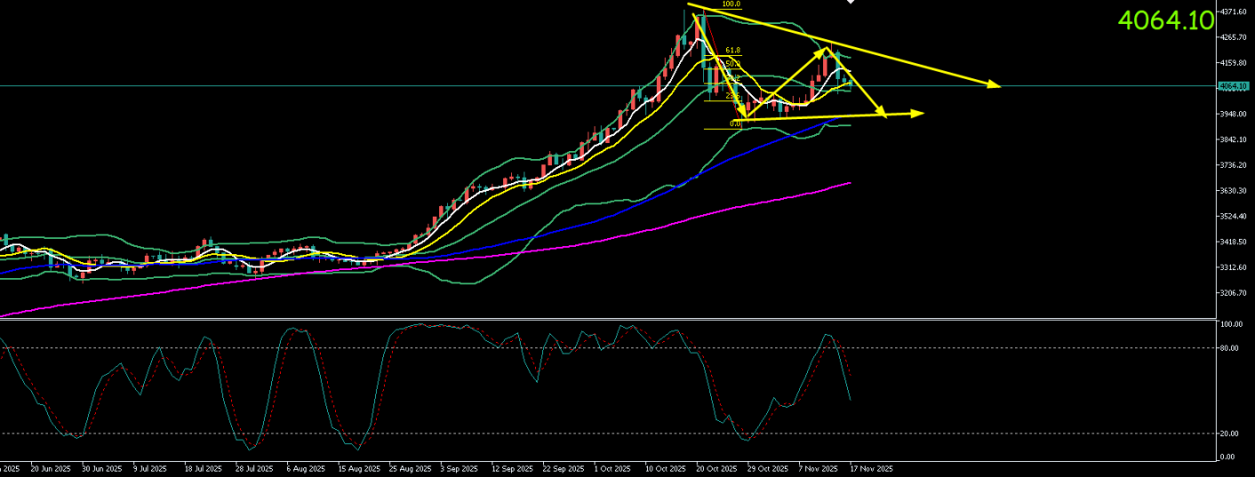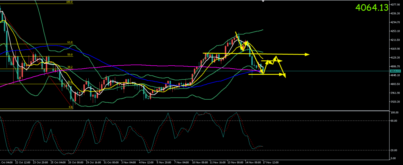 黄金周五(11.14)最高上探至4211.48美元/盎司,最低触及4032.15美元/盎司。收盘于4079.64美元/盎司,周一(11.17)开于4084.66元/盎司,截至目前最高上探至4106.45美元/盎司,最低触及4048.35美元/盎司,黄金4小时级二次探底,现报价4056.35