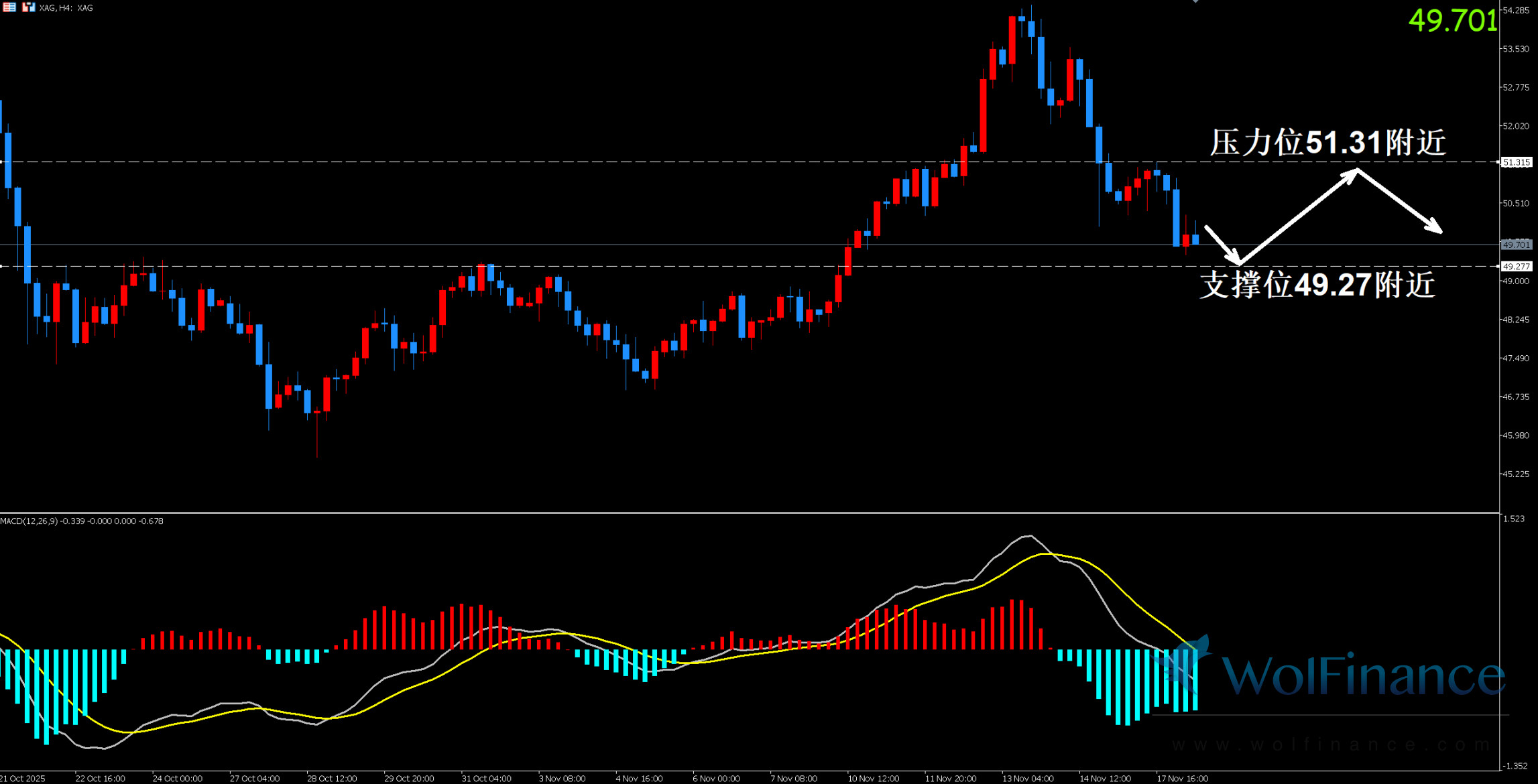 1. 白银技术图表显示目前K线支撑位49.98附近