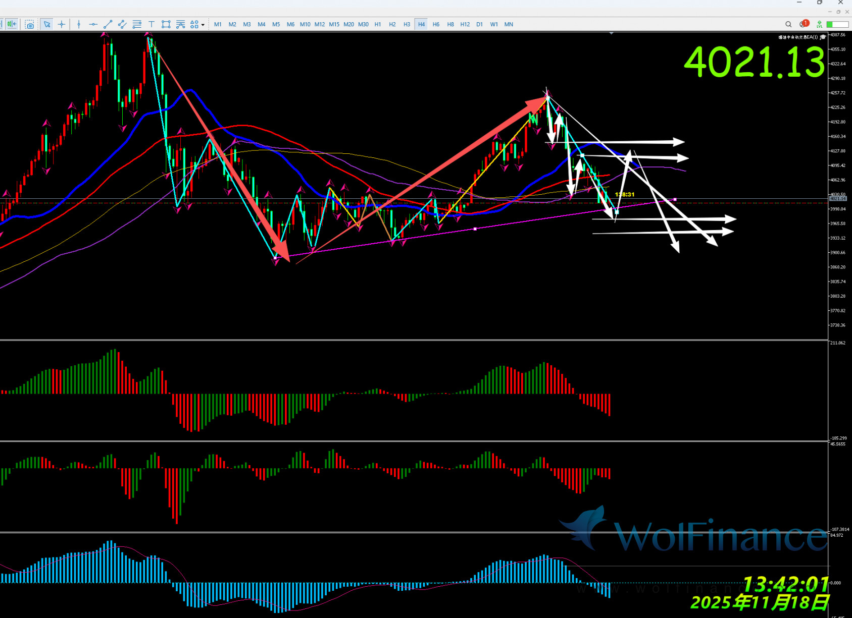 解析:日线AO 和AC红色红色,4小时AO和AC均为红色,2小时AO红和AC绿色,金价自4381跌至8小时120均线3886后走出完整1小时的下跌5浪结构够的反弹判定为4小时目前判定为反弹B浪中,此上涨浪由1小时的ABC浪来完成,目前1小时处于C-4中,1小时涨至4245后开始回落至1小时的60-89均线之间,30分钟完成了上涨5浪结构后开启了A浪回调,金价跌至4144后反弹至4144-4245的61.8%的位置后4211后30分钟上走出下跌走势跌至4小时的89均线4031.97,30分钟上AO指标向下产生了峰值形成了上涨5-3演变成了下跌A-3浪下方关注4011-3949-3911预期目标,昨日金价跌至4小时的89均线后反弹至15分钟的89和120均线之间一直被30分钟的蓝色线承压再次下跌延续了30分钟的主跌浪结构至目前最低点4004-4011区间,昨日15分钟反弹判定有效是故15分钟昨日判定为反弹4浪,金价自4095-4004下跌段判定为15分钟的5-3浪中理论上目标区间为4009-3993-3966-3949支撑预期,当下小周期5分钟上完成了15分钟的5-3浪且打出了低点40045分钟下跌浪形完整,是故日内先看5分钟的反弹结构组合成为15分钟的反弹4浪,若5分钟反弹站上4055且站上15分钟的120均线且站上4110则判定15分钟5-3浪有转化为反弹A-3浪预期则彻底看金价对4211-4004下跌段的调整预期,随后看30分钟调整4浪预期上方关注1小时的60-89-129均线压力预期;若5分钟的反弹段承压于15分钟的120均线则继续看跌预期下方关注4000-3984-3971-3960支撑预期。