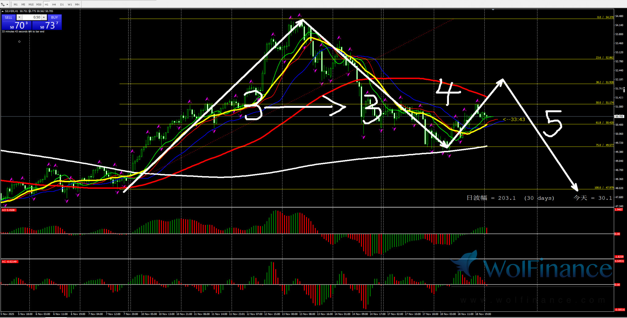 日线图目前处在4浪之中,关注4浪的行情走势。压力倾向在日线图54.40一线附近;支撑倾向在日线图50%(45.80)和61.8%(43.80)一线附近;四小时行情处在4浪走势;并关注上方压力53.40一线附近;1小时图AO零轴上红色;AC零轴下红色,行情在小时图356日线之上运行;小时图关注53.40附近的压力;所以今日关注1小时图震荡行情。