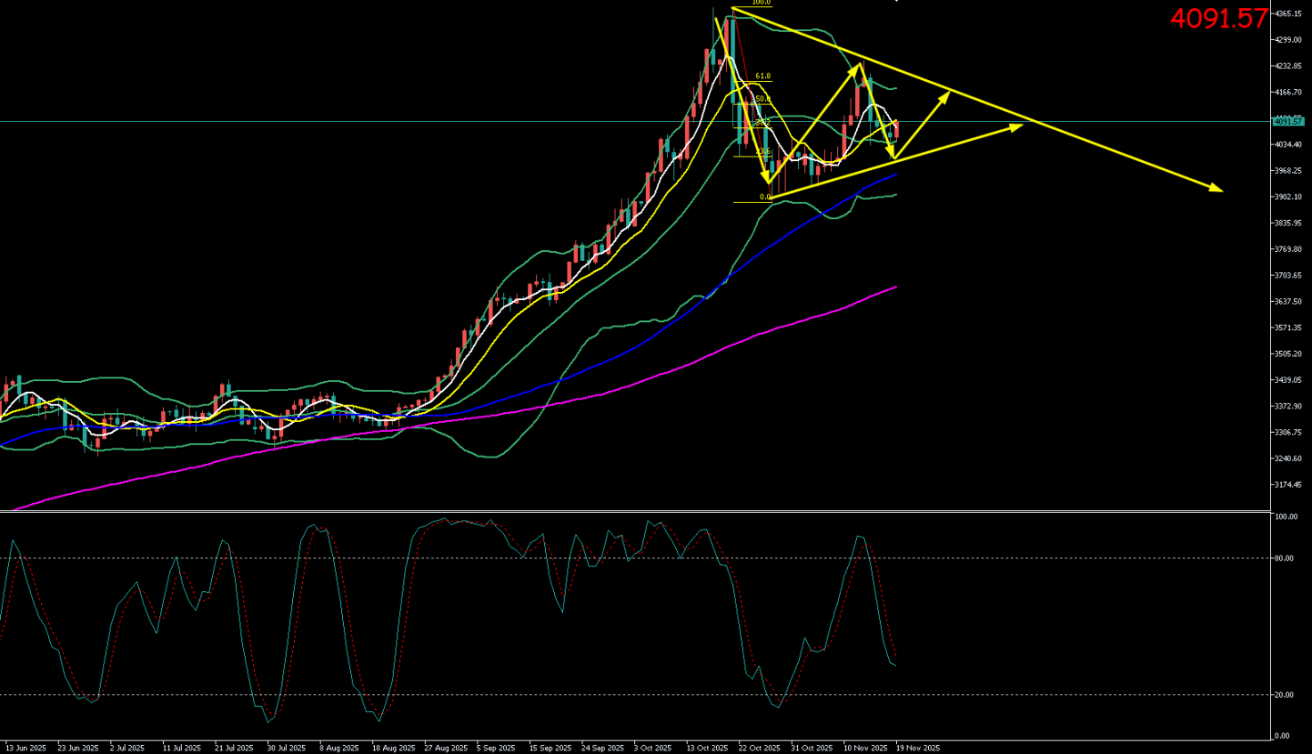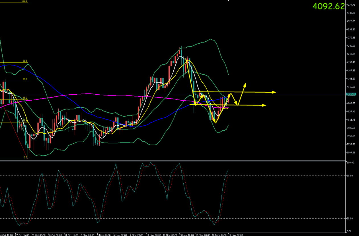 黄金周二(11.18)最高上探至4082.73美元/盎司,最低触及3997.56美元/盎司。收盘于4066.57美元/盎司,周三(11.19)开于4066.41元/盎司,截至目前最高上探至4089.78美元/盎司,最低触及4055.64美元/盎司,黄金小时线级别震荡上行,现报价4089.7
