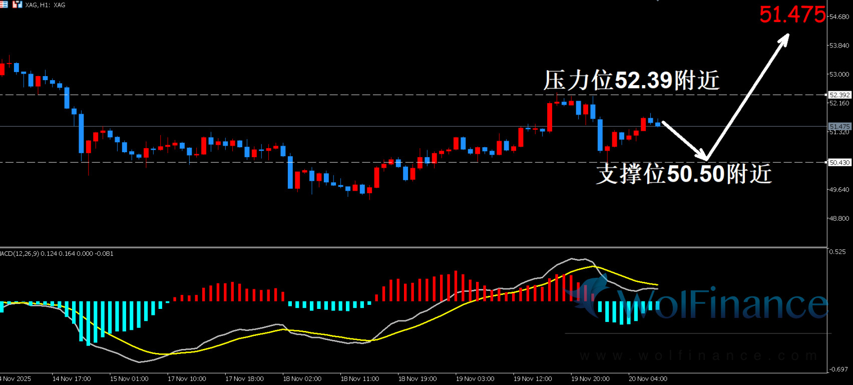 1. 白银技术图表显示目前K线支撑位50.50附近