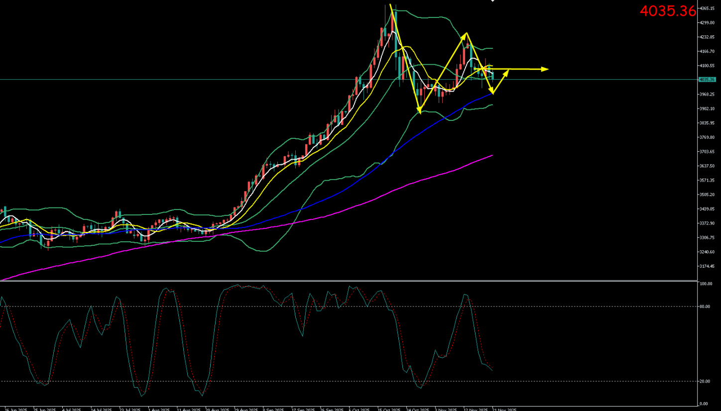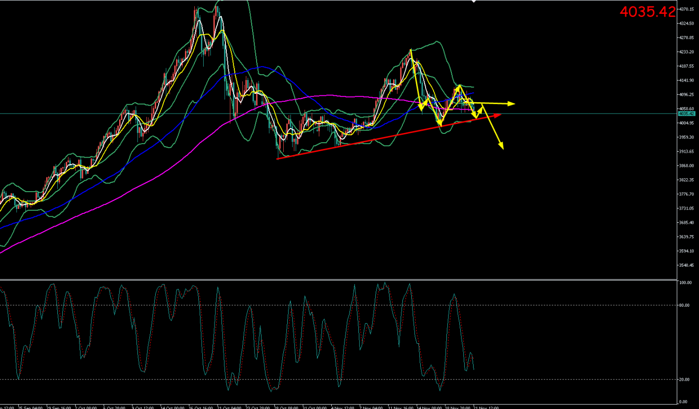 黄金周四(11.19)最高上探至4109.86美元/盎司,最低触及4037.63美元/盎司。收盘于4075.71美元/盎司,周五(11.20)开于4076.52元/盎司,截至目前最高上探至4089.48美元/盎司,最低触及4028.31美元/盎司,黄金小时线级别震荡下行,现报价4039.1