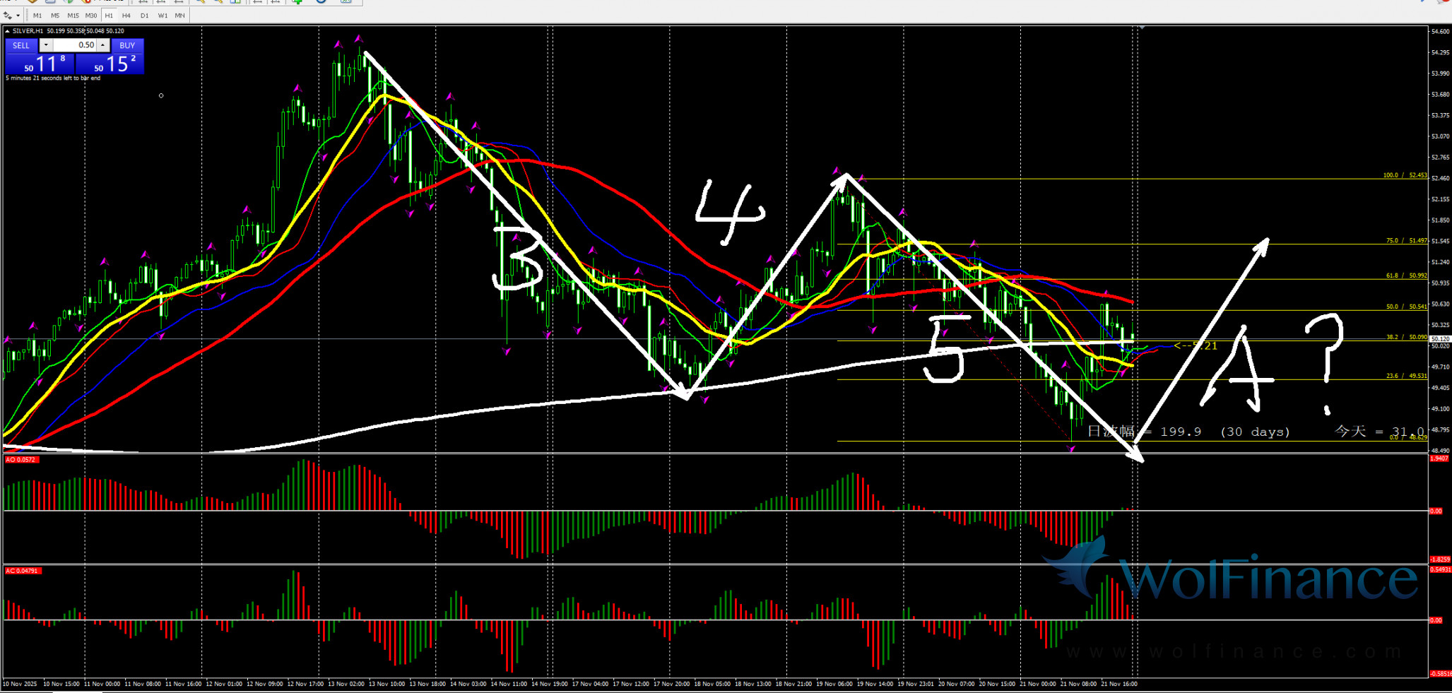 日线图目前处在4浪之中,关注4浪的行情走势。压力倾向在日线图53.40一线附近;支撑倾向在日线图50%(45.80)和61.8%(43.80)一线附近;四小时行情处在4浪走势;并关注4小时是否反转;1小时图AO零轴上红色;AC零轴下红色,行情在小时图356日线附近运行;小时图关注52.40附近的压力;所以今日关注1小时图震荡行情。