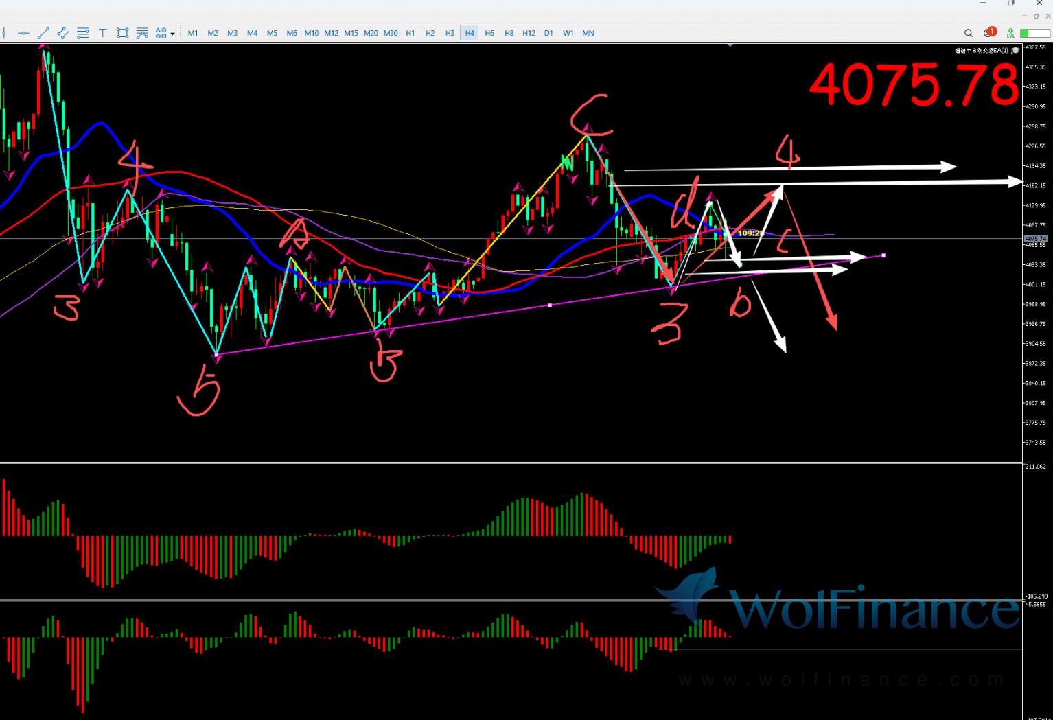 解析:日线AO绿色 和AC绿色,4小时AO和AC均为红色,金价自4381跌至8小时120均线3886后走出完整1小时的下跌5浪结构够的反弹判定为4小时目前判定为反弹B浪中,此上涨浪由1小时的ABC浪来完成,目前1小时处于C-4中,1小时涨至4245后开始回落至1小时的60-89均线之间,30分钟完成了上涨5浪结构后开启了A浪回调,金价跌至4144后反弹至4144-4245的61.8%的位置后4211后30分钟上走出下跌走势跌至4小时的89均线4031.97,30分钟上AO指标向下产生了峰值形成了上涨5-3演变成了下跌A-3浪下方关注4011-3949-3911预期目标,金价跌至4小时的89均线后反弹至15分钟的89和120均线之间一直被30分钟的蓝色线承压再次下跌延续了30分钟的主跌浪至目前最低点3997后反弹,15分钟自4031-4095反弹是15分钟4浪,金价自4095-3997下跌段判定为15分钟的5浪,目前金价自3997反弹至4082判定为15分钟的反弹A,此段上涨金价共振反弹改变了30分钟及1小时的AO 上穿越由此判定30分钟和1小时开启了对4245-3997下跌段的调整4浪的预期,金价反弹至4210-3997下跌段的61.8%对应的4132附近判定为30分钟的反弹4-a浪,之后从4232下跌之早间的3997-4132这段的38.2%对应的4040的下跌段判定为30分钟的下跌4-b浪,上周五金价跌至4022-4030支撑反弹至4101附近延续在4100-4130之间震荡,日内继续关注此区间震荡之后选择方向,若上破4103则上看4150-4183区间,若下破则看日线的120均线及12小时的120均线支撑预期。