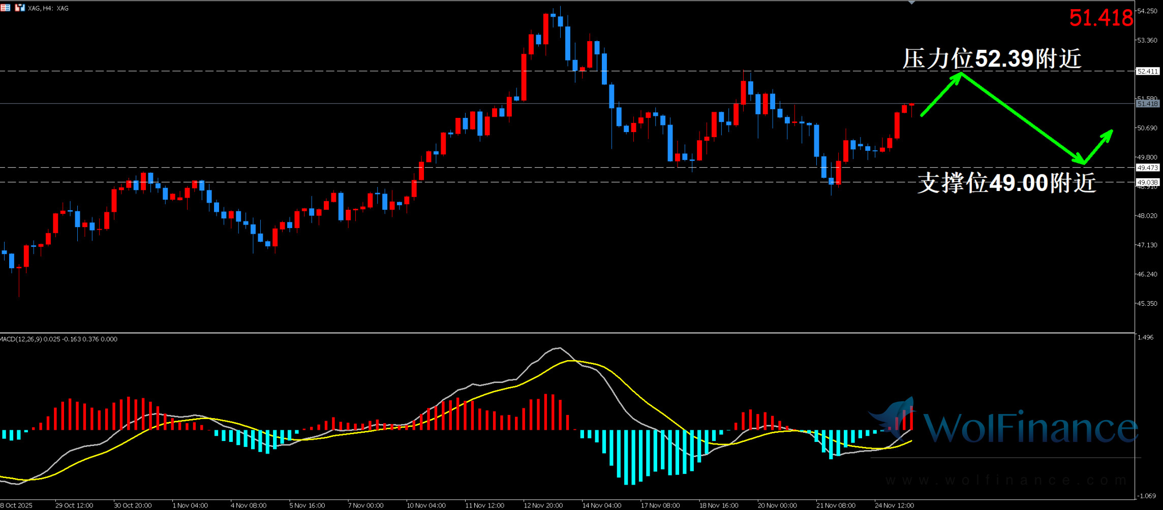 周二(11月25日)白银亚盘震荡走高,关注压力位空单布局。白银现货价格51.39附近。其他贵金属跟随黄金涨势:现货白银上涨1.7%至每盎司50.84美元;铂金上涨2.3%至1545.91美元;钯金上涨1.7%至1398.21美元。分析师认为,在美联储政策辩论与地缘政治波动的双重影响下,黄金仍将维持在当前区间震荡格局。另一位重量级人物、纽约联储主席威廉姆斯上周五也表示,美国利率“短期内可能下降”,且不会危及2%通胀目标。旧金山联储主席戴利周一更是直接“倒戈”,从此前对连续第三次降息犹豫不决,转为明确支持12月行动。芝商所FedWatch工具最新数据显示,12月降息25bp的概率已高达81%,较一周前大幅跃升。市场越来越相信美联储12月必然降息。”在实物利率下行、通胀预期温和的背景下,黄金作为零息资产的吸引力被彻底激活。