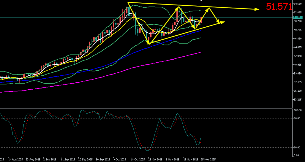 白银周一(11.24)最高试探51.44美元/盎司,最低触及49.69元/盎司。收盘于51.33美元/盎司。周二(11.25)开于51.37美元/盎司,截至目前最高上探至51.68元/盎司,最低试探至51.01,现报51.67元/盎司附近.